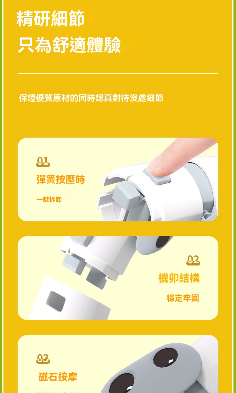 • 一鍵拆卸便攜:設有彈簧按壓式卡扣,結合機卵結構,既可穩定鎖定防止脫落,又能一鍵快速拆解,方便收納與攜帶。