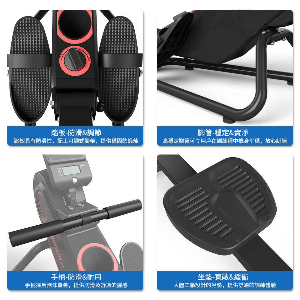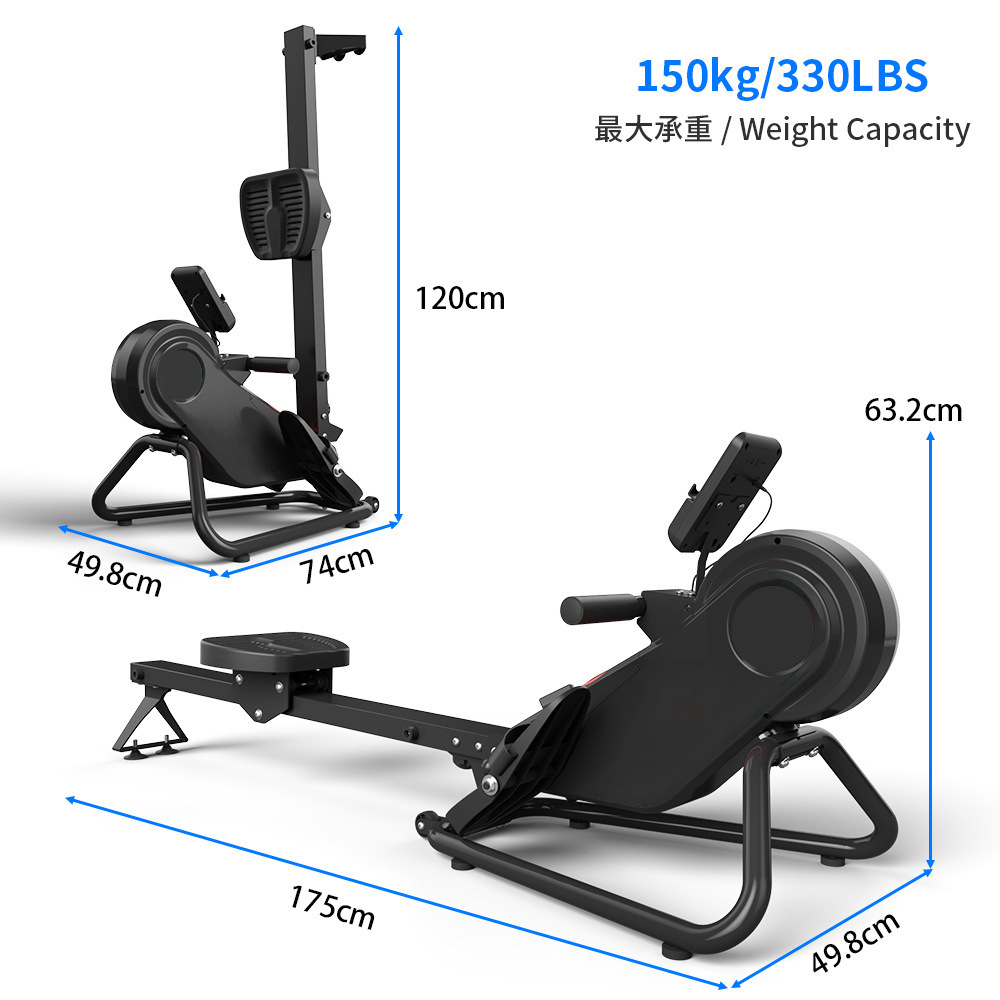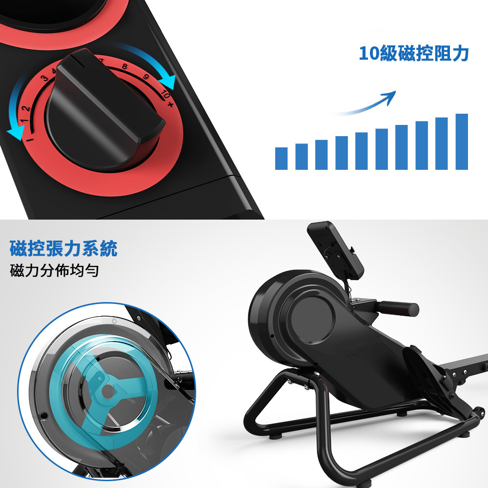 這款家用可摺疊划艇機配備10級磁控阻力系統,磁力分布均勻,能模擬真實水上划艇體驗。它採用全方位鍛鍊設計,能針對肩三角肌、肱二頭肌、腹肌、背闊肌、臀大肌、股四頭肌及腓腸肌等多個肌肉群進行訓練。產品結構穩固且實用,踏板具有防滑性並配有可調式帶,手柄採用泡沫包裹提供舒適握感,坐墊則符合人體工學設計。機身設有多功能LCD顯示屏,可實時追蹤時間、速度、里程、卡路里等數據。此外,它支持藍牙連接Fitshow APP(兼容IOS及Android),方便記錄及查看運動數據。此划艇機最大承重達150kg,且為可摺疊設計,便於收納。