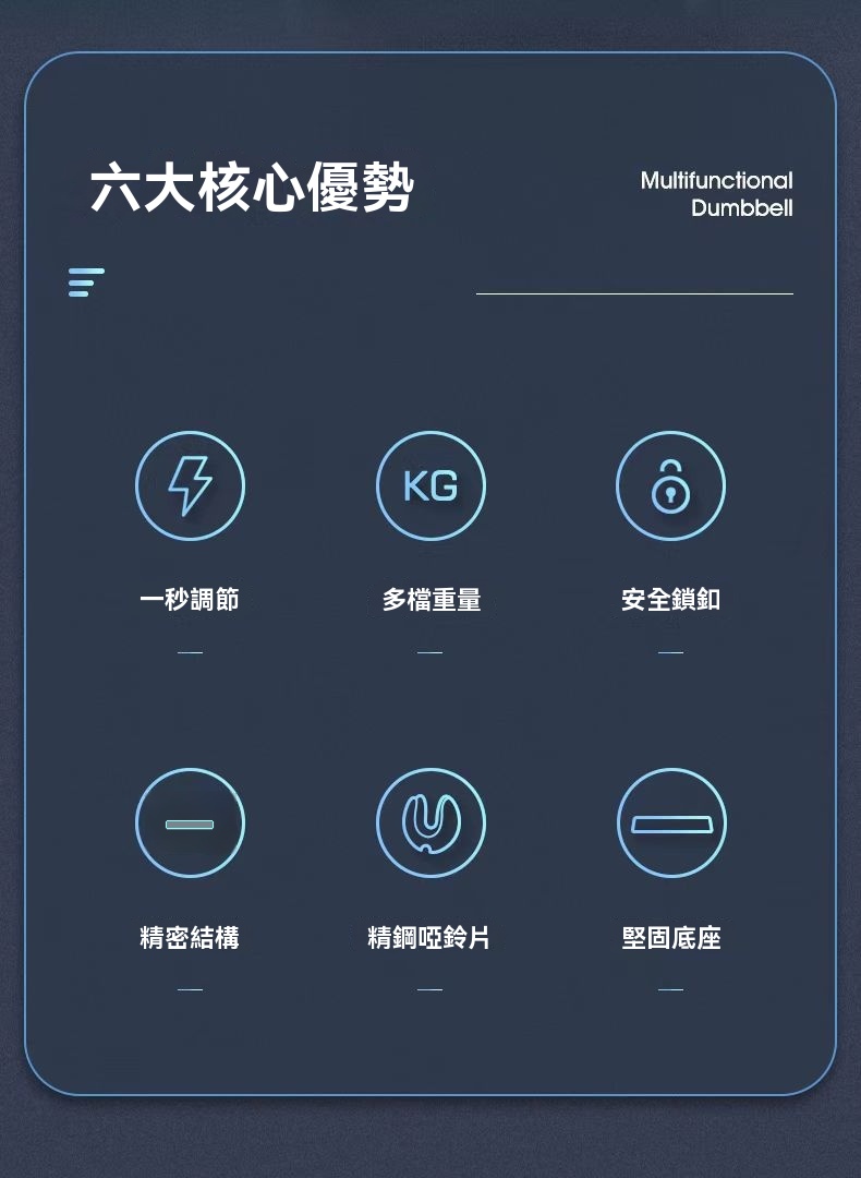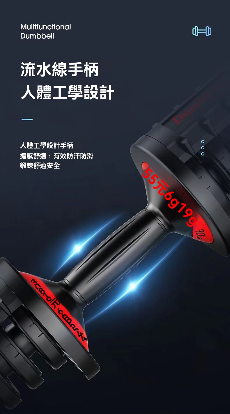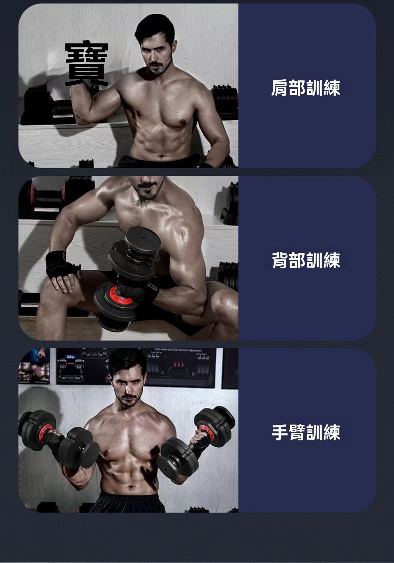 • 一秒快調系統:輕轉握把即可在5檔重量間快速切換,突破傳統啞鈴束縛,訓練節奏不中斷。
