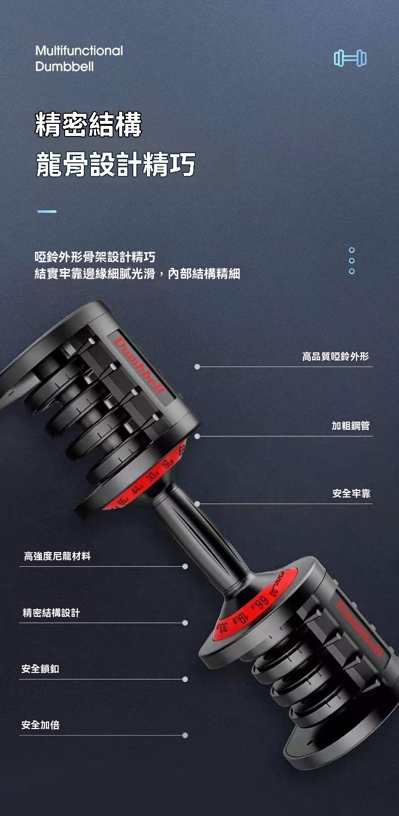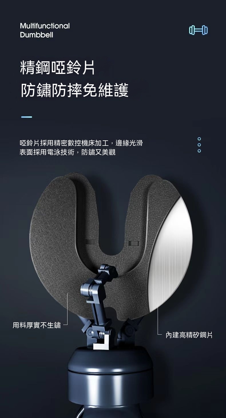 • 多重安全鎖卸結構:內建精密鎖死機構,確保調節後啞鈴片穩固不鬆動,使用安全加倍。