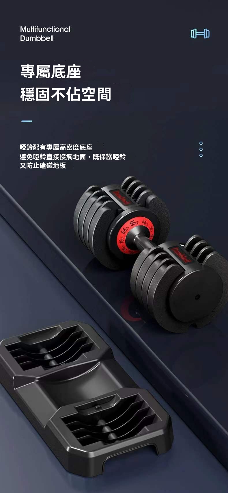 • 專屬高密度底座:標配專用底座,收納穩固不佔空間,避免啞鈴直接接觸地面,保護器材與地板。