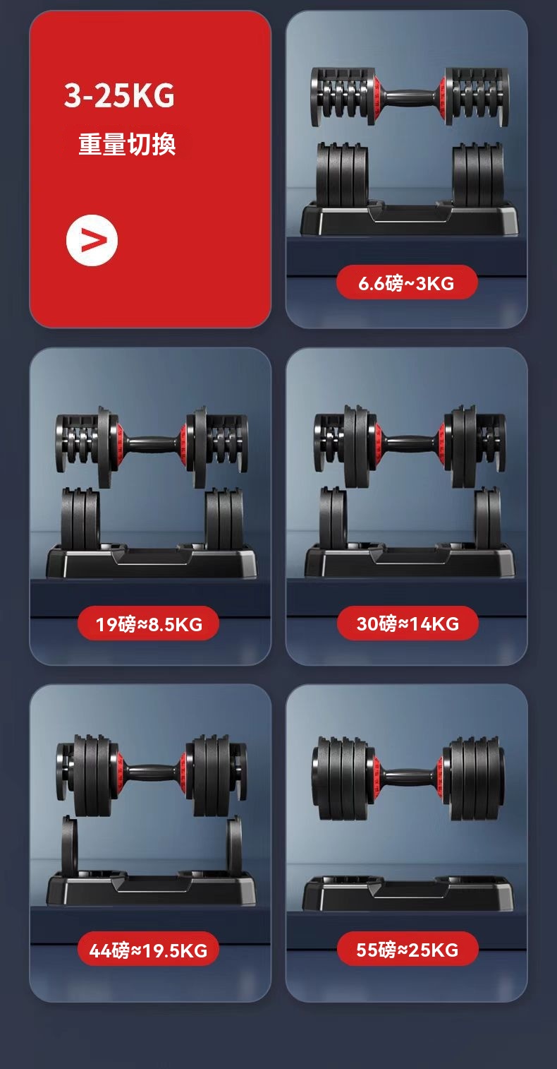 這款[32KG]可調節啞鈴,一鍵旋轉手柄即可在7LB至70LB(3.5KG至32KG)五檔間快速切換,突破傳統啞鈴重量固定、佔用空間的局限。啞鈴片採用精密數控機床加工,內建高精砂鋼片,表面經電泳技術處理,防鏽美觀;手柄符合人體工學設計,防汗防滑。產品擁有實用新型專利,內建多重鎖卸結構,安全加倍。標配專屬高密度底座,收納穩固不佔地,且避免啞鈴直接磕碰地板。一個啞鈴即可滿足多部位訓練需求,是兼具精密結構與實用性的居家健身選擇。
