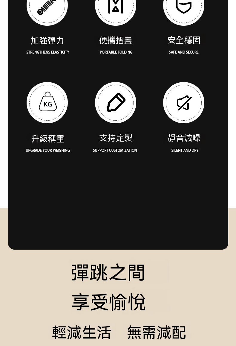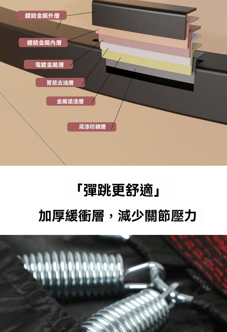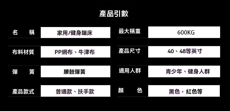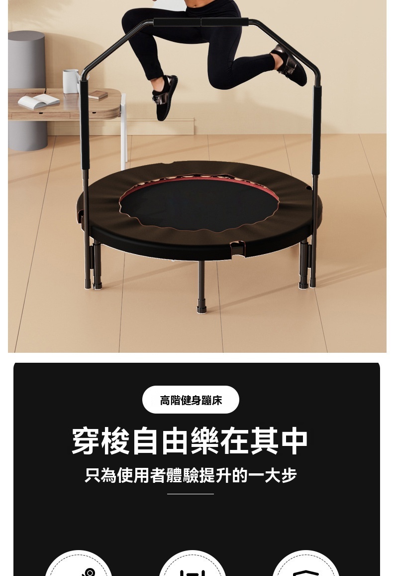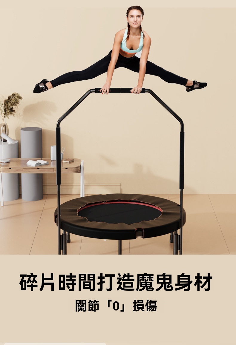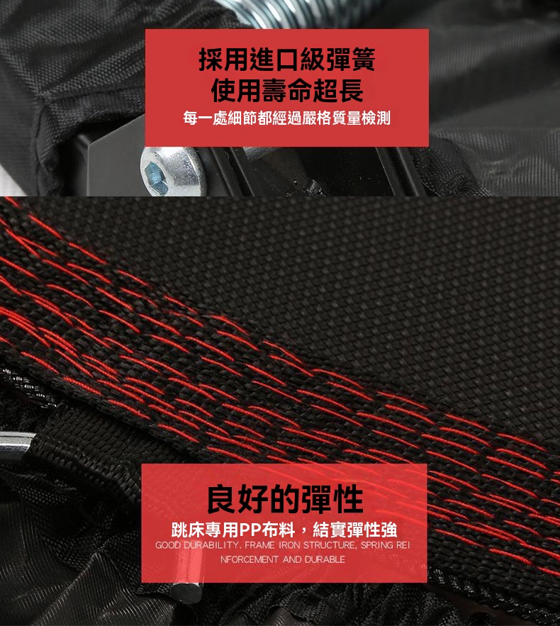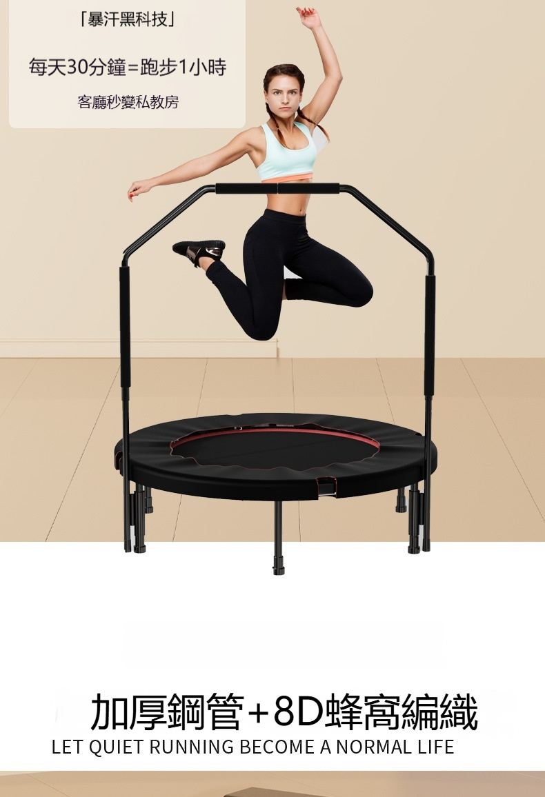 這款40英寸紅色健身蹦床為附扶手款式,專為家用及健身房場景設計,最大承重達600KG。採用腰鼓彈簧與精鋼骨架,回彈有力且加倍承重,較友商產品更耐用。彈跳區選用PP網布與牛津布,結實彈性强,搭配加厚緩衝層,有效減少關節壓力。產品支援便攜摺叠,可對半或四折收納,不佔空間。經鍍鉻金屬多層防鏽處理,彈簧使用壽命長。每天30分鐘運動相當於跑步1小時,靜音體驗適合居家燃脂、釋放壓力,亦能作為健身房課程器材,提升訓練樂趣。