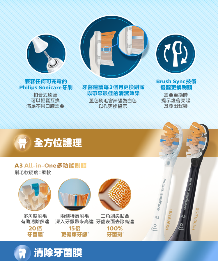 • A3 Premium All-in-One 刷頭是您獲得更乾淨潔白牙齒***和更健康牙齦的唯一所需。這款刷頭讓您在 2 週**內清除多達 20 倍的牙菌膜*、去除多達 100% 牙菌斑**並帶來 15 倍更健康的牙齦