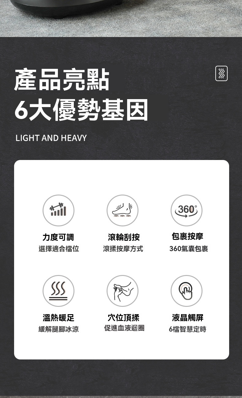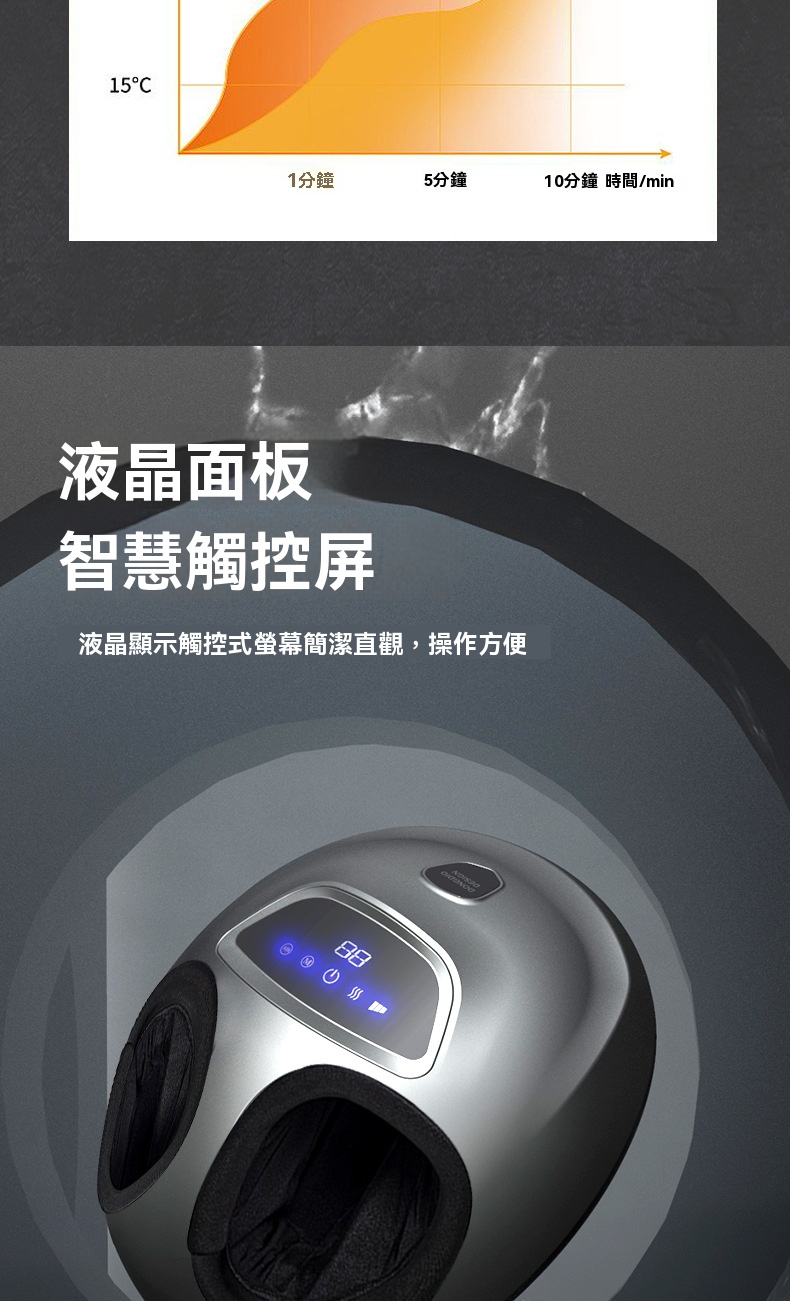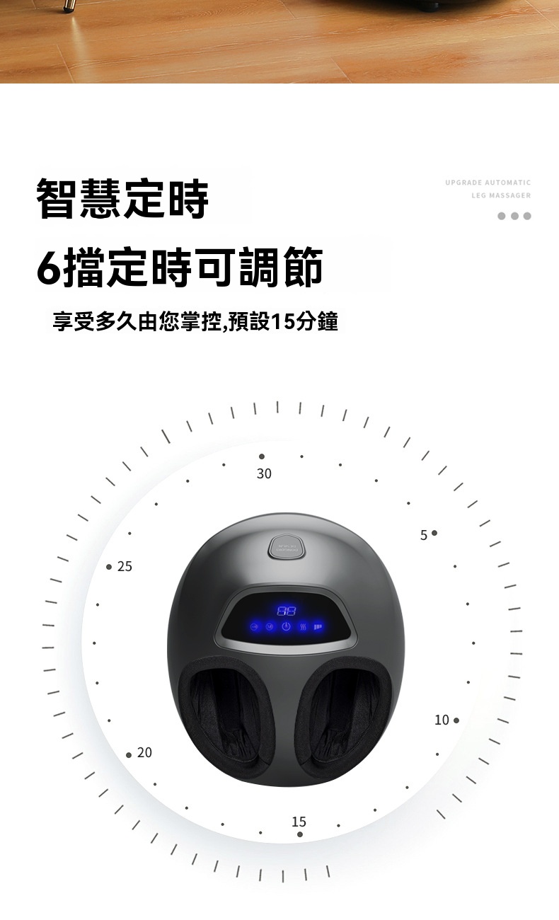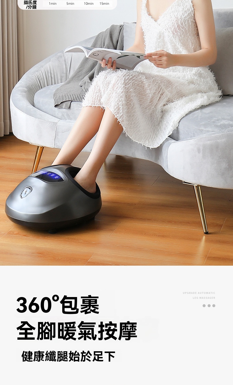 這款全自動智慧足部按摩器 - 灰色,是一款集多種理療手法於一身的家用足療設備。產品採用360°全包裹氣囊設計,通過氣囊收縮模擬人手揉捏,可針對足背肝經等穴位進行夾壓按摩;底部配備分割槽式滚輪刮痧,前段凸點滚輪深入心肺反射區,中段針對湯泉穴進行深度刮痧,後段則能頂壓跟腱養護生殖穴反射區。機器支援力度可調與多種模式選擇,搭載恒温熱敷功能,一键開啟可快速升溫,緩解腿部冰涼。操作方面採用液晶觸控面板,簡潔直觀,支援6檔智慧定時(如15分鐘預設),老人也能輕鬆操控。產品額定功率45W,電源線長2.4米,提供舒適的足部深層理療體驗。