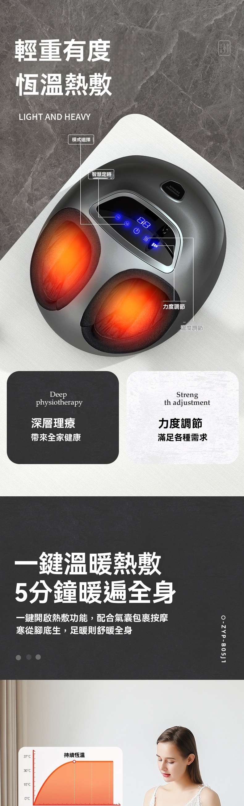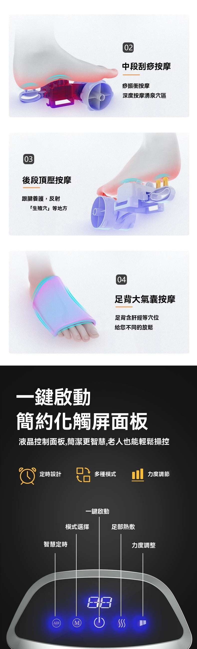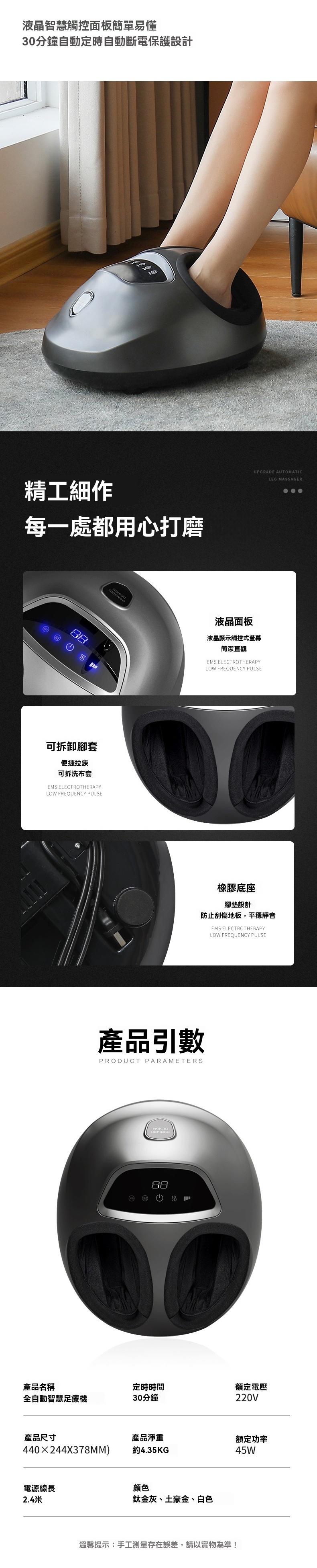 這款全自動智慧足部按摩器 - 灰色,是一款集多種理療手法於一身的家用足療設備。產品採用360°全包裹氣囊設計,通過氣囊收縮模擬人手揉捏,可針對足背肝經等穴位進行夾壓按摩;底部配備分割槽式滚輪刮痧,前段凸點滚輪深入心肺反射區,中段針對湯泉穴進行深度刮痧,後段則能頂壓跟腱養護生殖穴反射區。機器支援力度可調與多種模式選擇,搭載恒温熱敷功能,一键開啟可快速升溫,緩解腿部冰涼。操作方面採用液晶觸控面板,簡潔直觀,支援6檔智慧定時(如15分鐘預設),老人也能輕鬆操控。產品額定功率45W,電源線長2.4米,提供舒適的足部深層理療體驗。