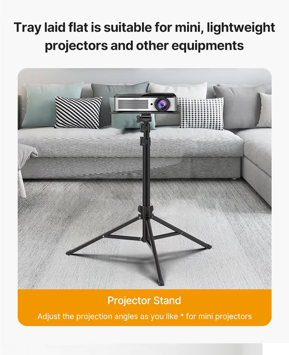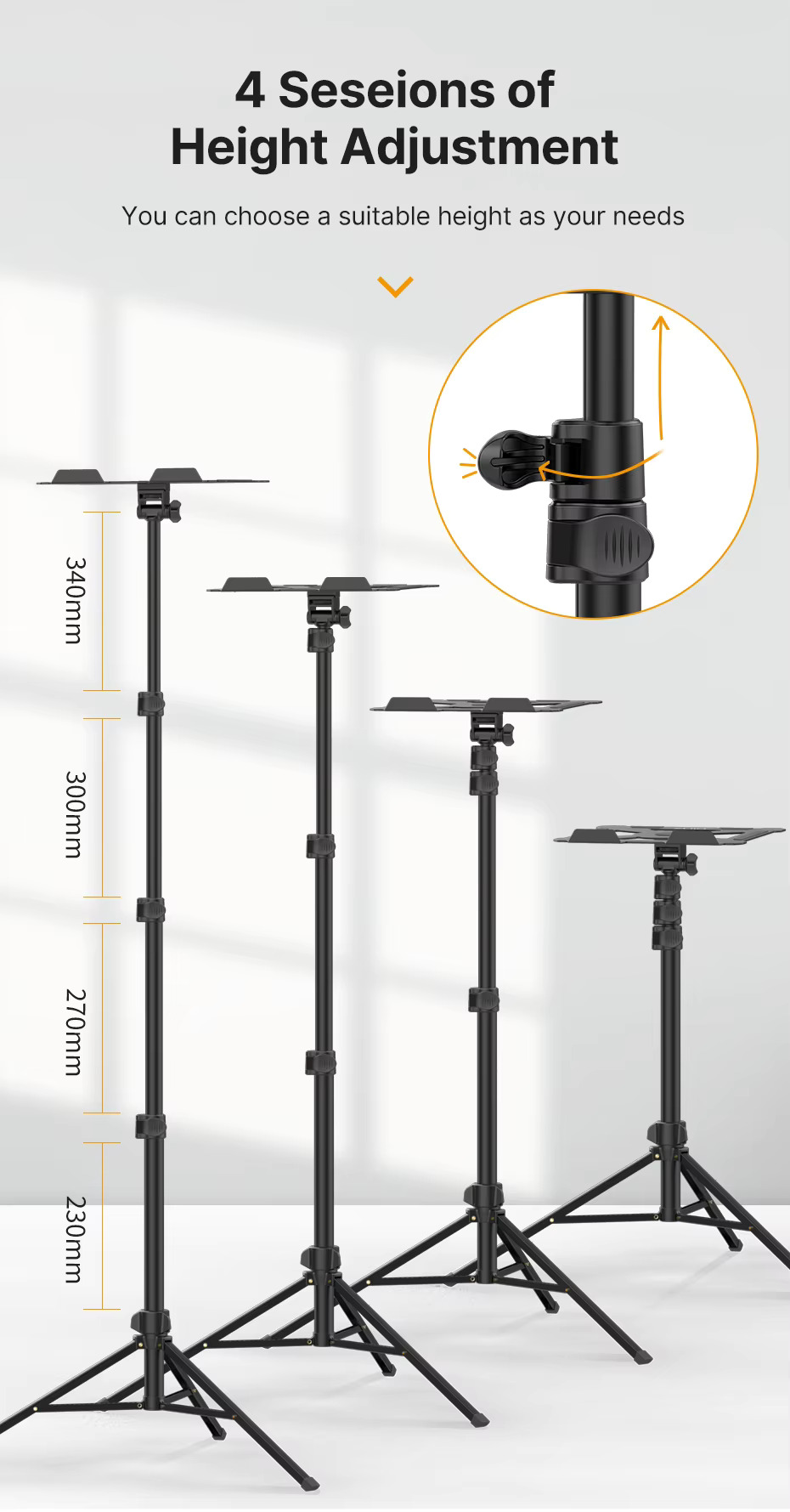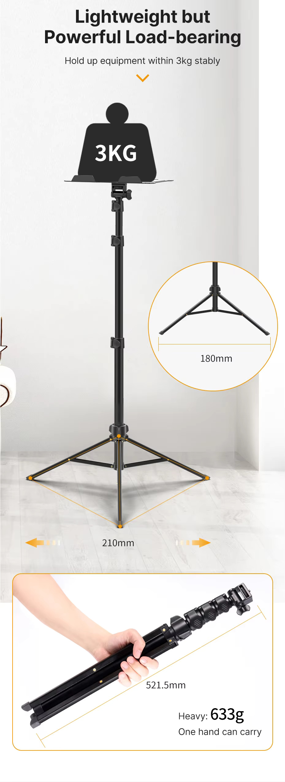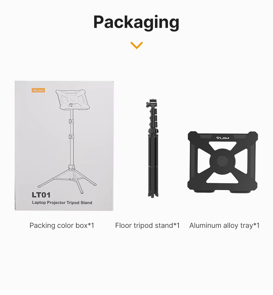 Ulanzi VIJIM LT01金屬四合一折疊三腳架,黑色外觀展現出沉穩質感。它融合創新設計,集多功能於一身,滿足多樣化拍攝需求。材質選用鋁合金與鐵,既保障1.28kg的輕盈便攜,又擁有3kg強大承重。托盤可180°前後、360°水平調節,內建矽膠墊防滑耐磨。採用三角中軸固定結構,4檔高度從60cm至150cm自由切換。大面積空心托盤設計,利於設備散熱。無論是投影機、電腦、平板,還是樂譜、DJ設備等,它都能輕鬆承載,是居家、辦公、表演等場景的得力助手 。