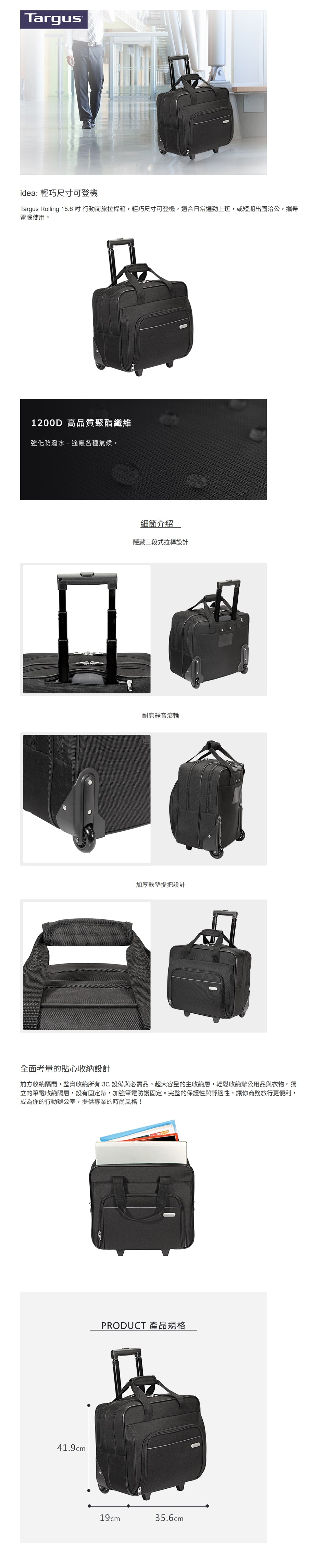 TARGUS TBR003 Rolling 15.6 吋行動​​商務拉桿箱,輕巧尺寸可登機,是日常通勤與短期商務出行的優選。箱體採 1200D 聚酯纖維製成,強化防潑水,適應多種氣候,底部防護設計能減少碰撞刮傷。配備耐磨靜音滾輪,滑順無遲滯,搭配隱藏式三段調節拉桿與加厚軟墊提把,攜帶舒適便捷。收納設計貼心實用,設獨立筆記本隔層(含固定帶),適用 15.6 吋以下筆記本電腦,前方隔層可收納 3C 設備,大容量主艙可容納辦公用品與衣物,兼具防護與時尚感,打造移動辦公空間。