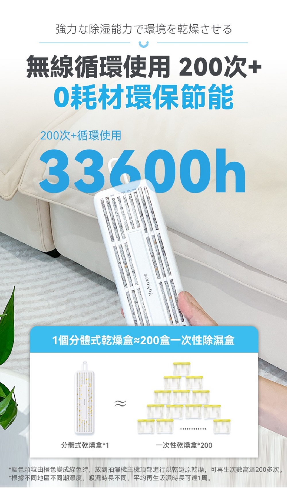 • 依不同地區不同潮濕度,吸濕時長不同,平均再生吸濕時長可達1週。