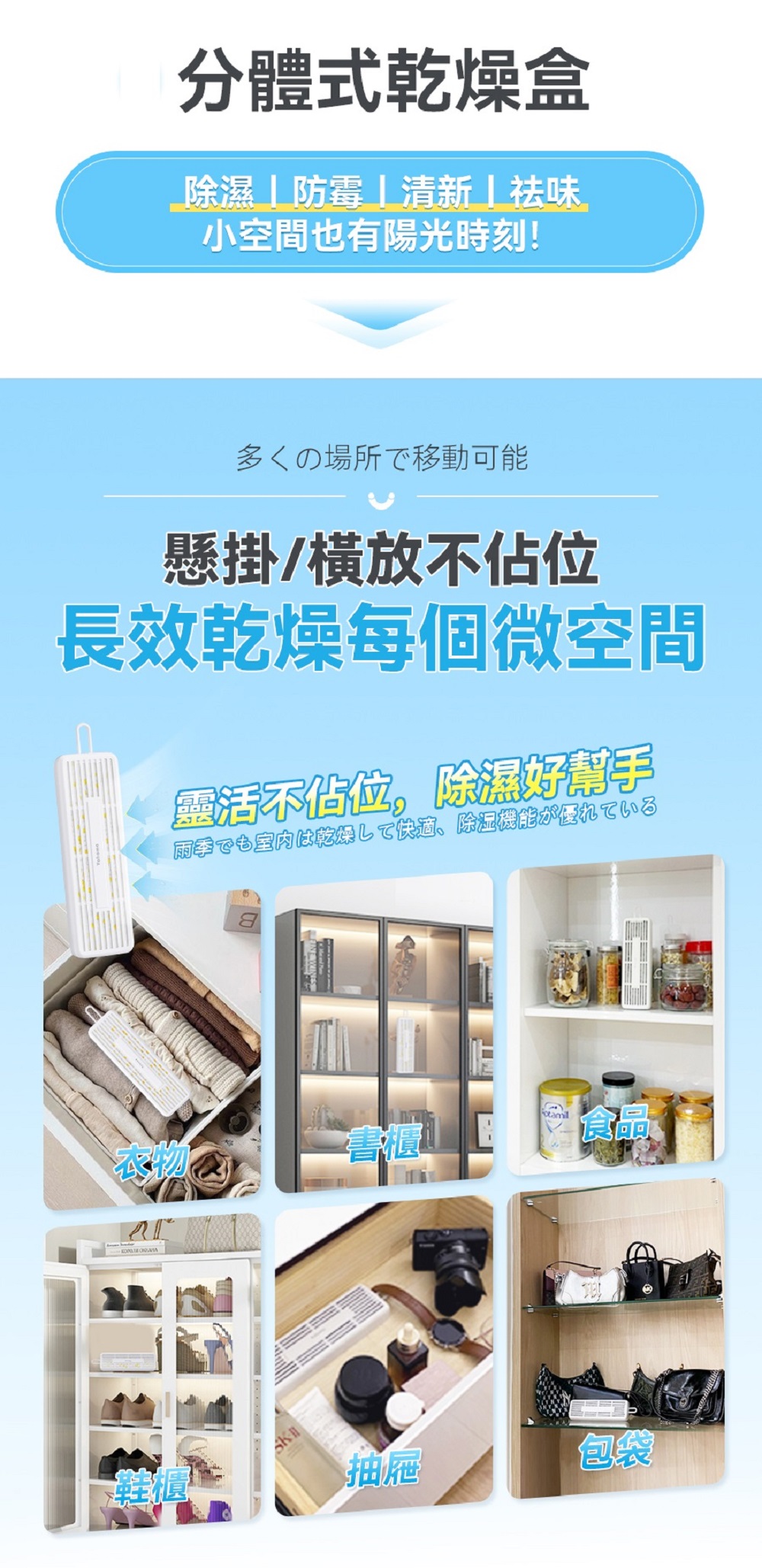 • 獨特半導體+乾燥劑雙除濕結構,環境、衣櫃同時保持乾燥,乾燥劑可再生使用。