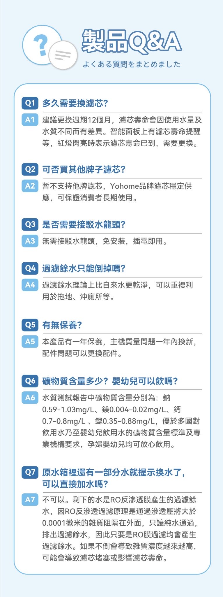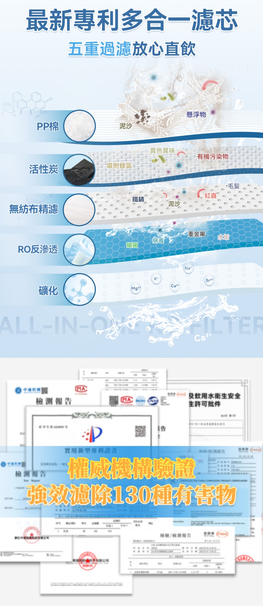 濾芯適配 YH-005、YH-019 機型,採用最新專利多合一設計,實現五重過濾。以 PP 棉、不織布精濾、活性碳、RO 逆滲透等材質,達成 0.0001 微米過濾精度,可濾除泥沙、紅蟲、鐵鏽等雜質,吸附餘氯與異色異味,濾除水垢、重金屬及 130 種有害物質,病菌去除率 99.99%,出水純淨。濾芯總淨水量 2000L,淨重 0.57kg,建議更換週期 12-24 個月(受用水量與水質影響),智慧面板會紅燈提醒更換。支援 YOHOME QUICKSPIN 快速換芯,三步驟即可完成操作。產品經中通檢測等權威機構驗證,獲飲用水衛生安全許可批件,搭配主機使用時,主機支援自清潔模式,可一鍵清洗濾芯管道,還能顯示 TDS 水質情況,且具備 4:1 廢水比,減少水資源浪費。