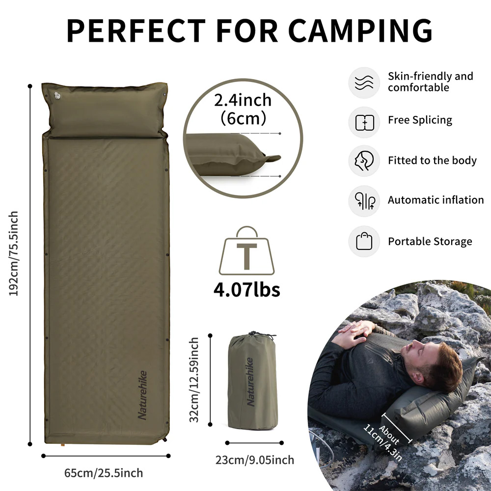 • 舒適隔熱:採用190T滌塔夫PVC面料,搭配19層海綿結構,打造柔軟耐用的自充氣睡墊表面。優異的保溫與防水性能,確保戶外活動中的溫暖與舒適。19層海綿設計使這款帶枕頭的睡墊即使在崎嶇地面也能提供卓越緩衝。