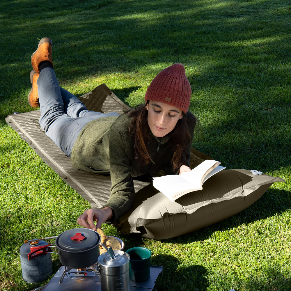 • 一體式枕頭設計:有別於普通睡墊,此款露營墊配有整合式枕頭,免去額外攜帶枕頭的負擔。創新設計減輕背包重量同時確保舒適度,枕頭配備雙層氣閥防止空氣逆流與滲漏。