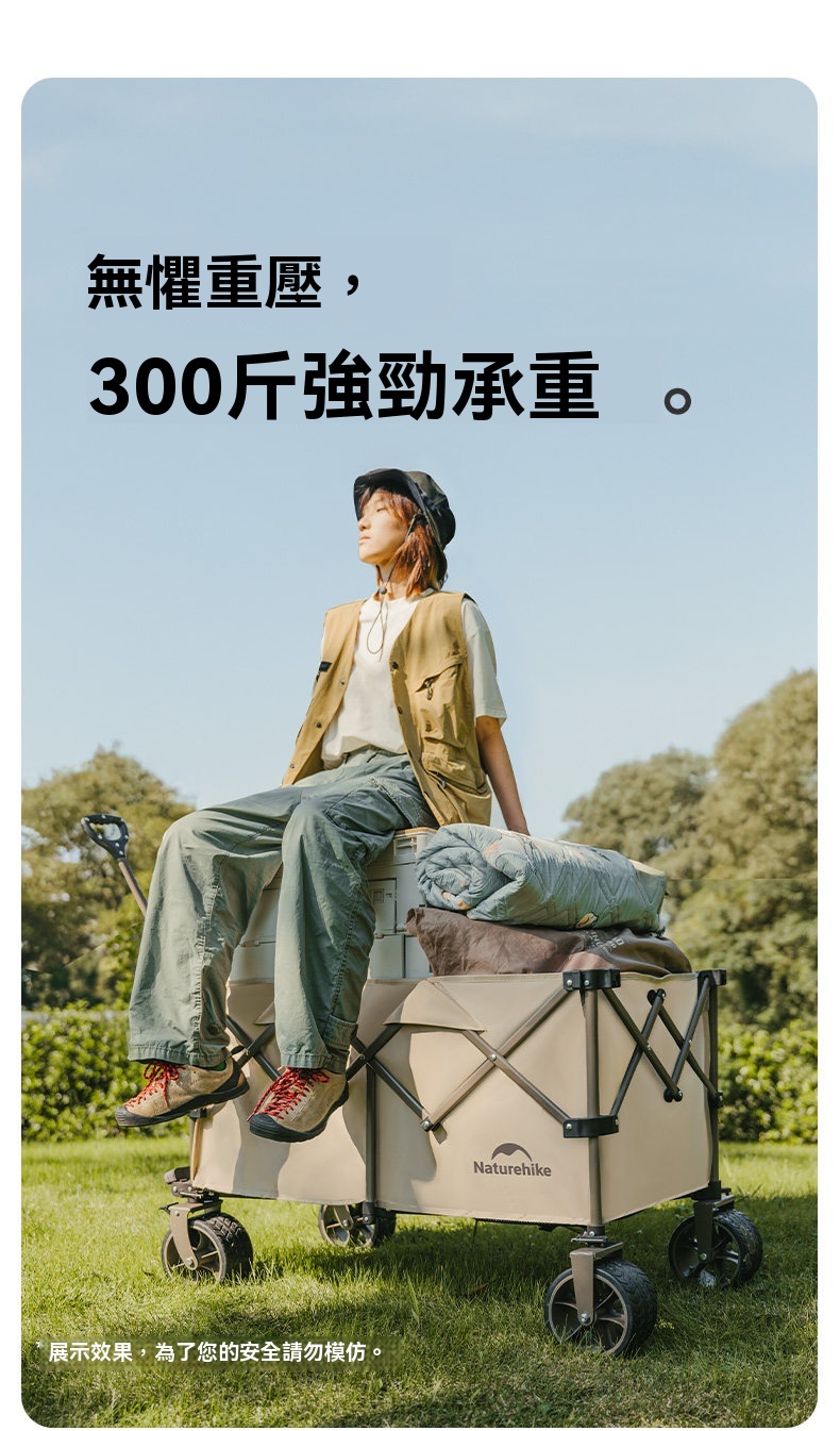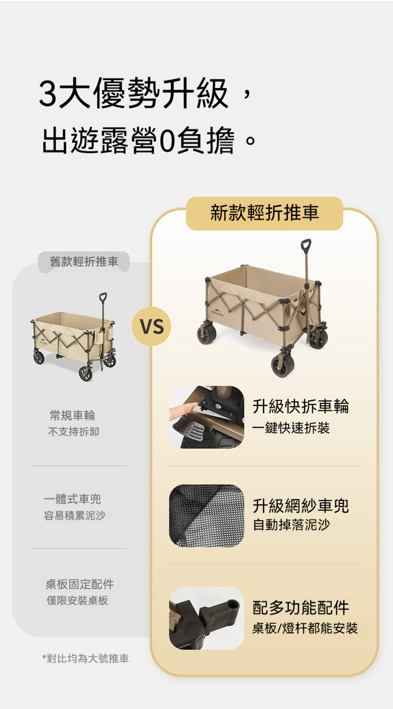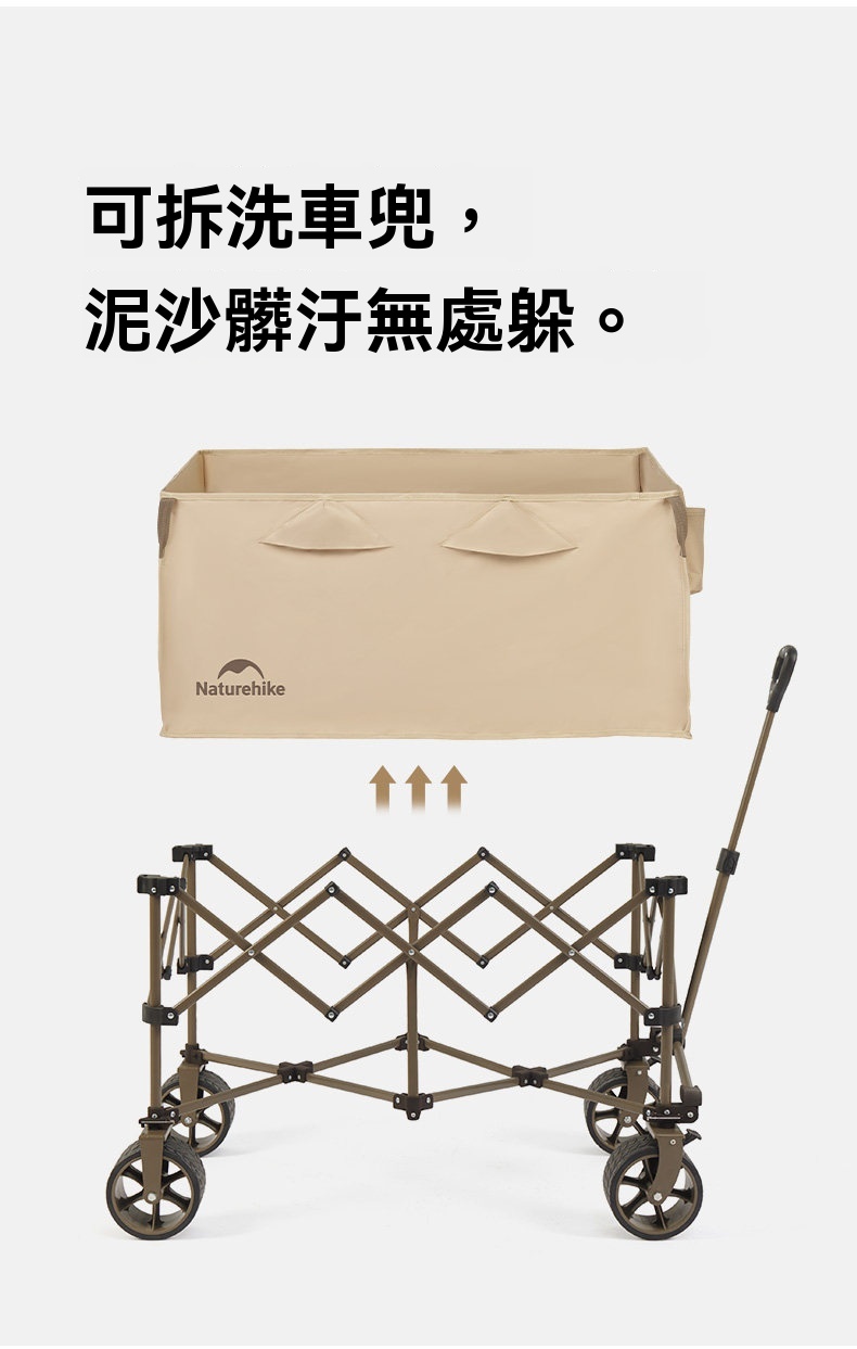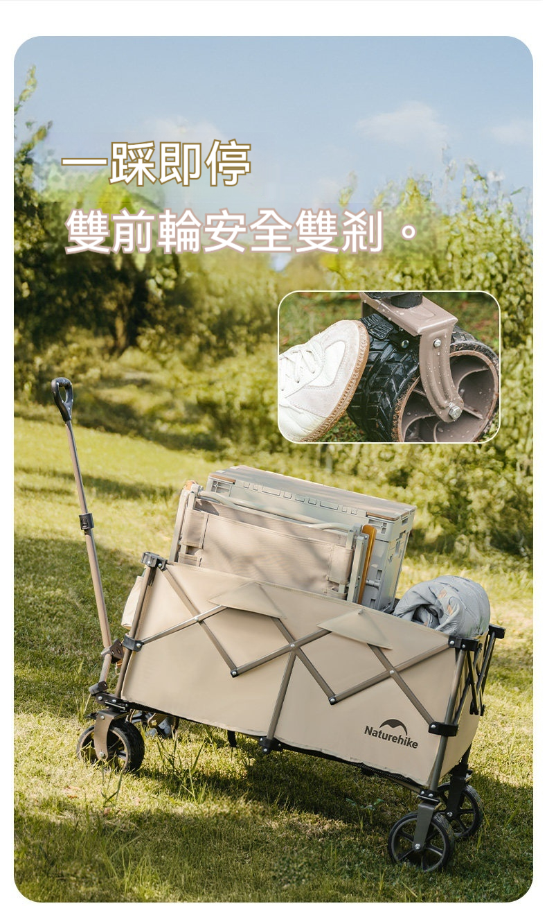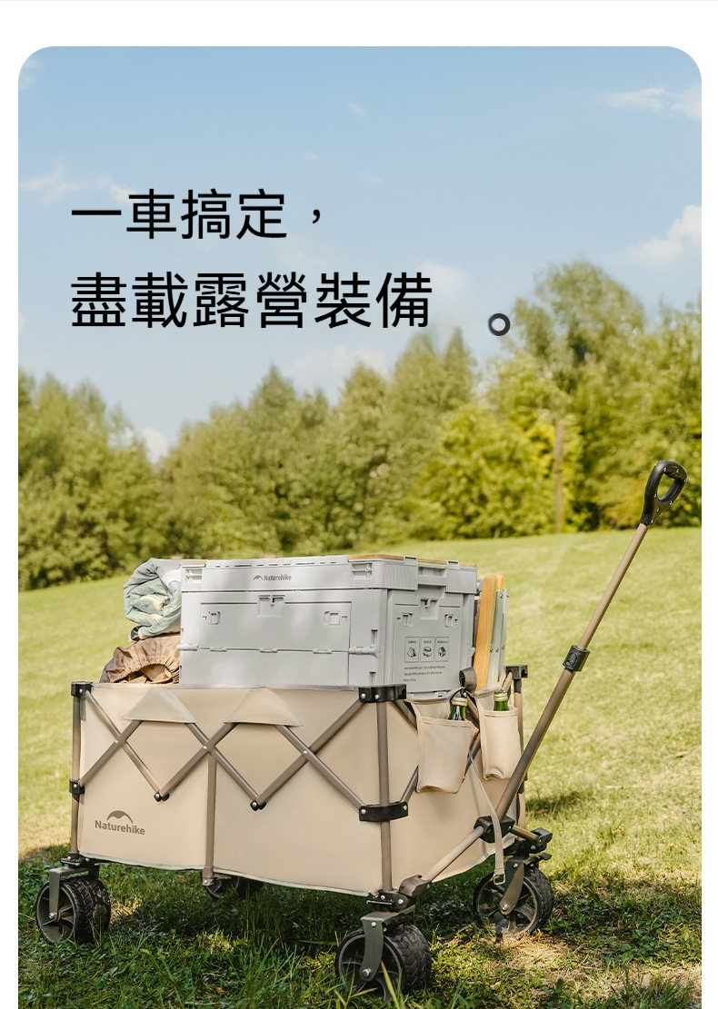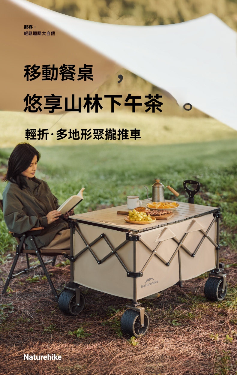 Naturehike 輕折 · 全地形聚攏露營推車,專為戶外露營裝備運輸設計。擁有高承重與大容量,搭配360°防滑越野輪與快拆結構,輕鬆應對砂石、泥濘等多種路況。可拆洗網紗車兜不易積沙,並支援安裝桌板或燈杆等多功能配件,收納後體積小巧,實現輕鬆搬運與高效收納。