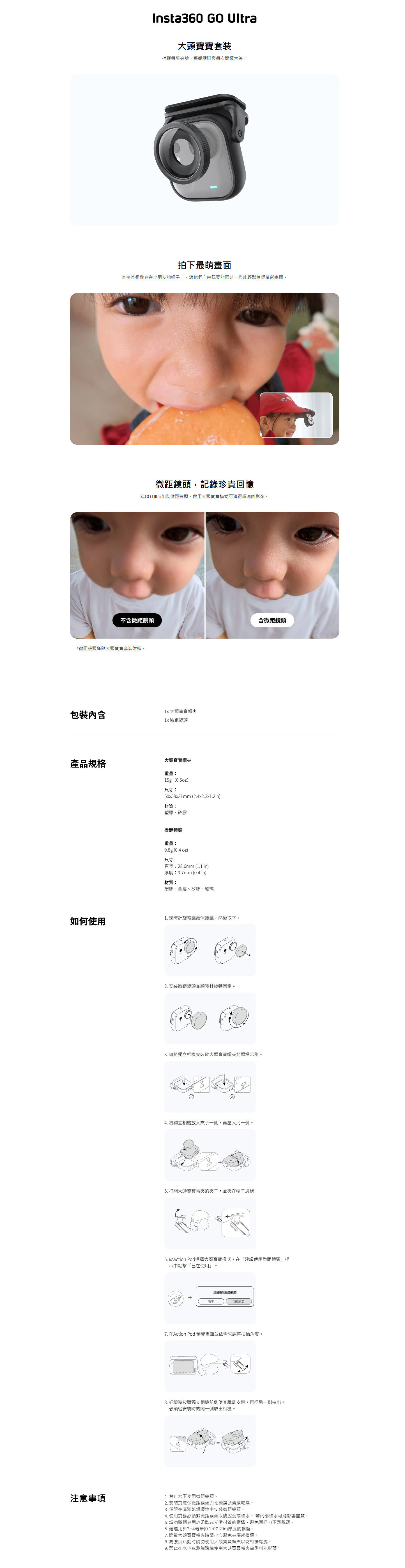 Insta360 GO Ultra 大頭寶寶套裝是一款專為記錄孩童成長時刻設計的創意配件組合。套裝內包含一個可夾在帽簷上的「大頭寶寶帽夾」和一個專用的「微距鏡頭」。將GO Ultra相機固定在帽夾上,即可從孩子的第一視角,輕鬆捕捉他們玩耍、探索時的笑臉和精彩瞬間。加裝隨附的微距鏡頭並啟用大頭寶寶模式後,更能拍攝超清晰的特寫影像,細膩記錄每一份可愛。使用時需注意:微距鏡頭和帽夾均禁止在水下或潮濕環境中使用,且帽夾建議用於厚度2-4毫米的帽簷,以確保穩固安全。