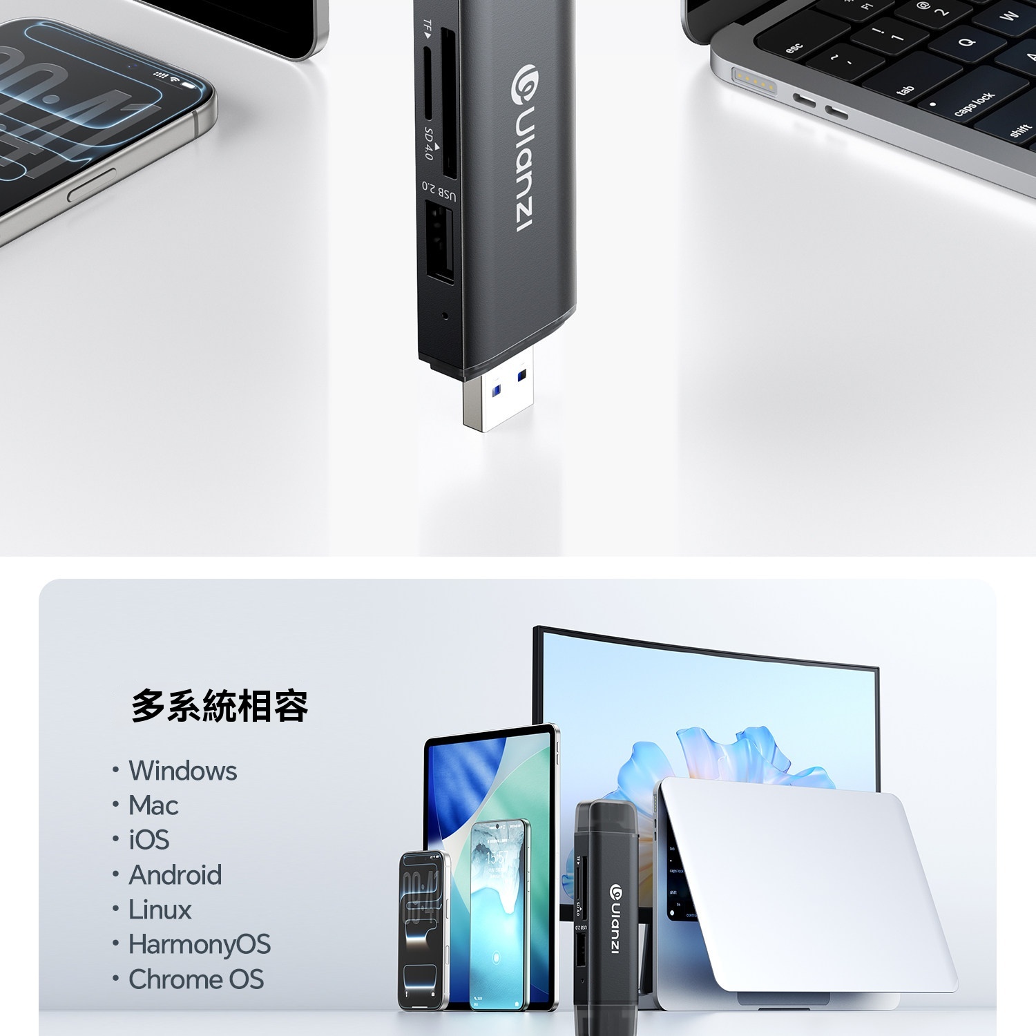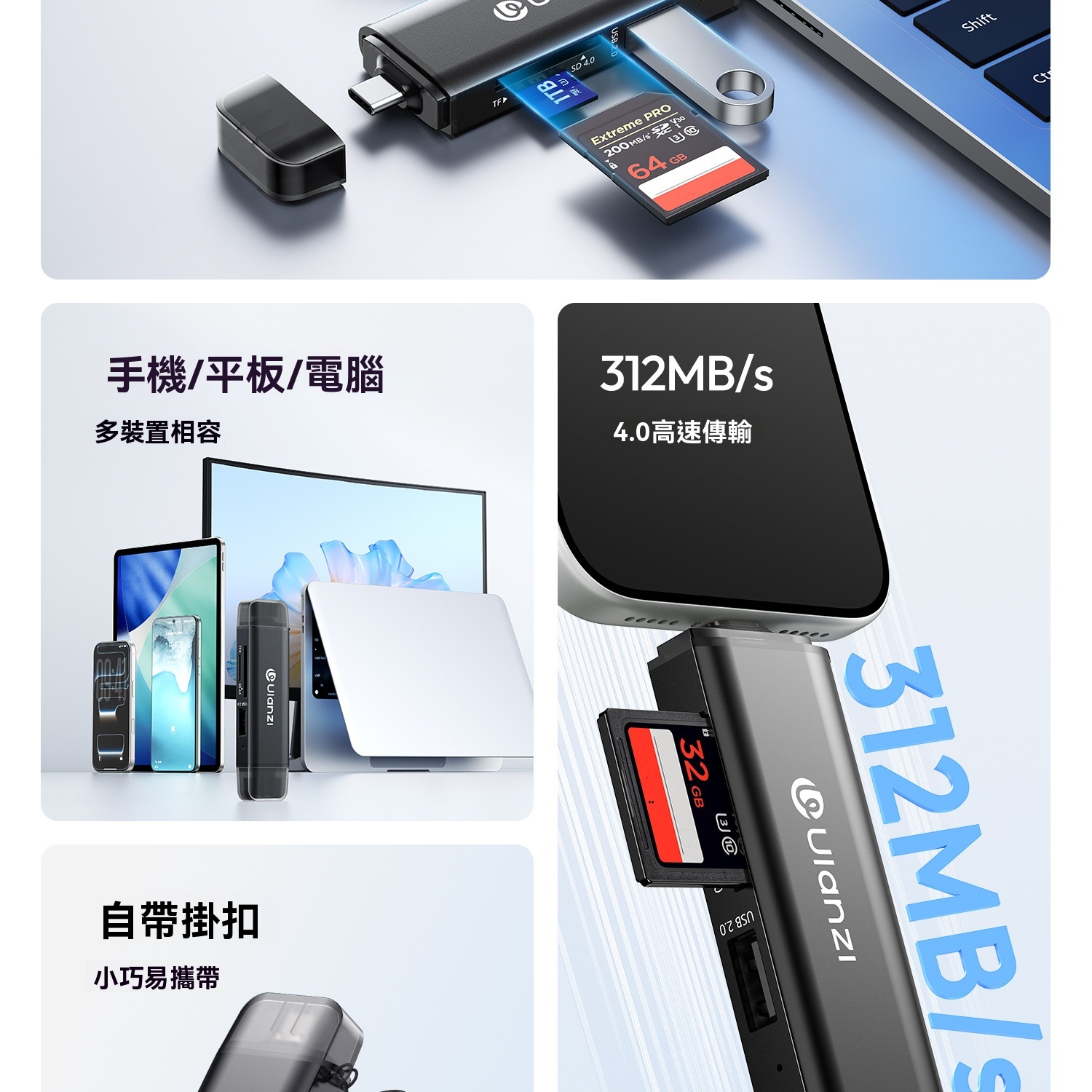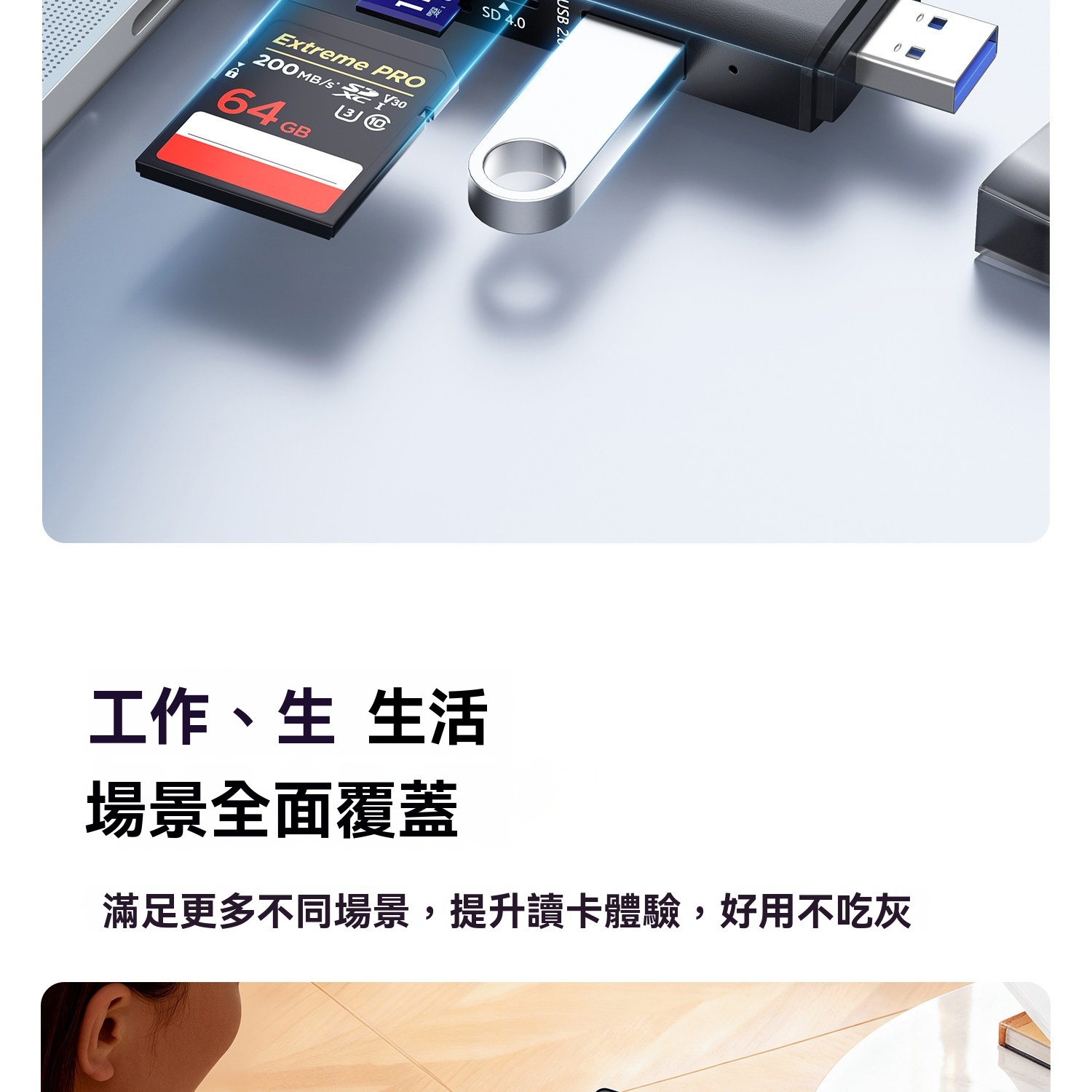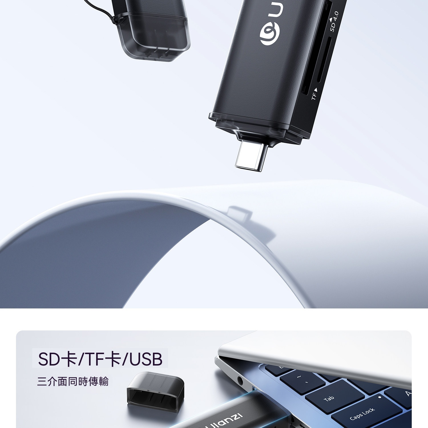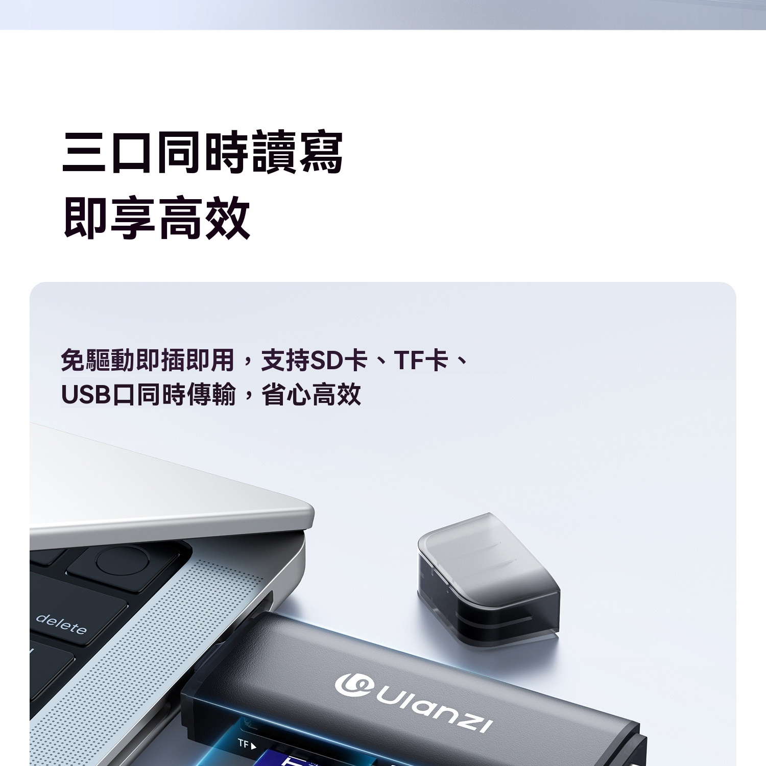 • 支援SD、TF、USB三口同讀,即插即用免驅動