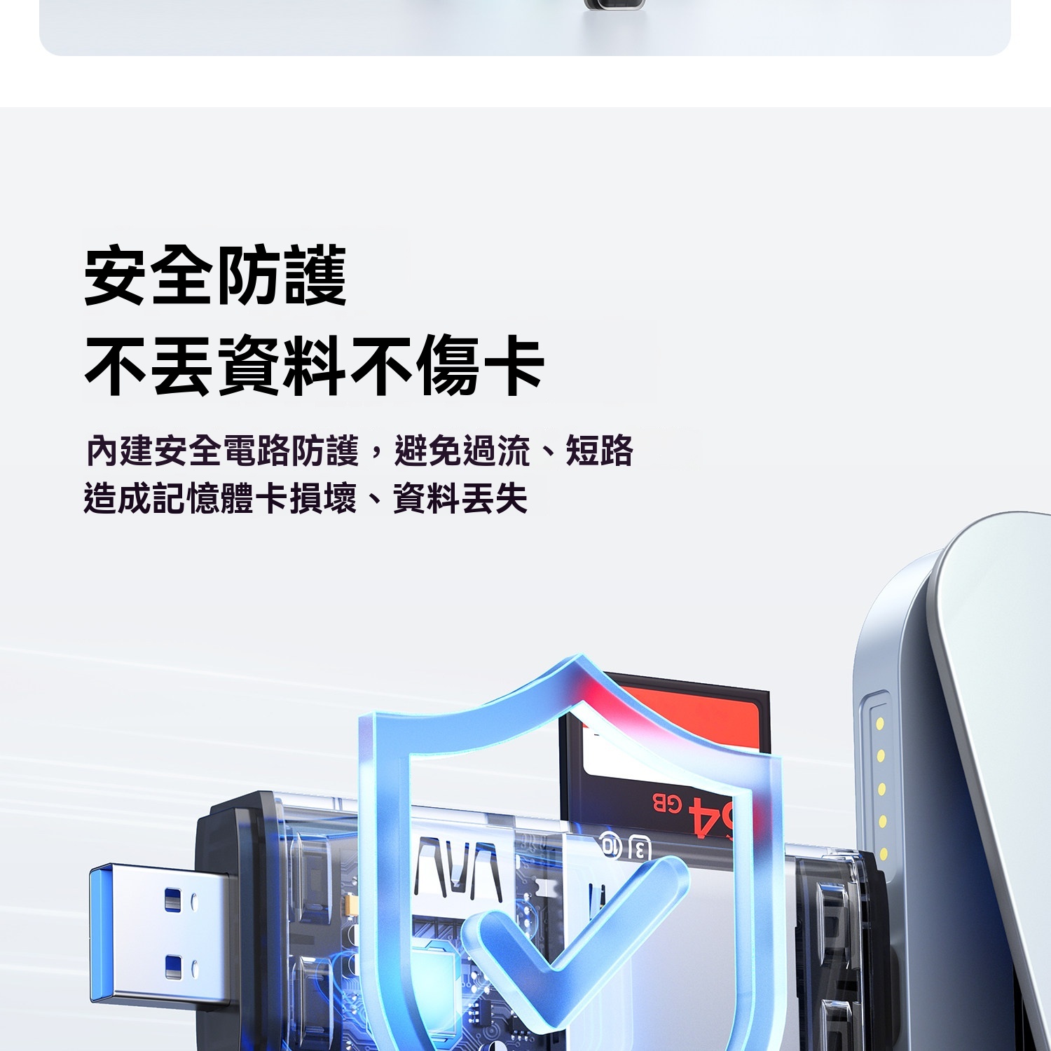 • 內置安全防護電路,防止過流或短路損壞記憶卡及資料