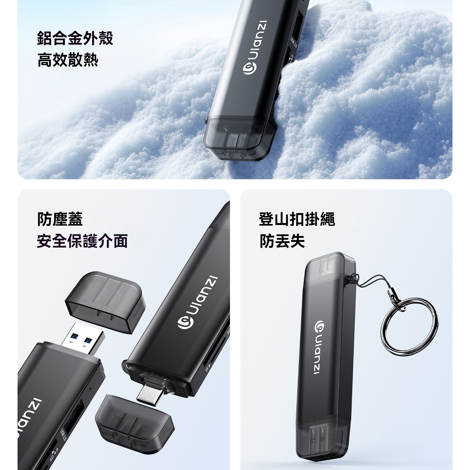 Ulanzi CR3 三合一讀卡機 4.0 是一款輕巧便攜的高速讀卡器,專為現代多設備傳輸需求設計。它支援SD卡、TF卡和USB設備三口同時讀寫,理論傳輸速率高達312MB/s,大幅提升檔案傳輸效率。採用USB-C和USB-A雙界面,相容於手機、平板、電腦等多種裝置,並支援多種作業系統。內置安全防護電路,搭配鋁合金外殼散熱,防塵蓋保護接口,自帶登山扣掛繩,方便攜帶且防丟失。