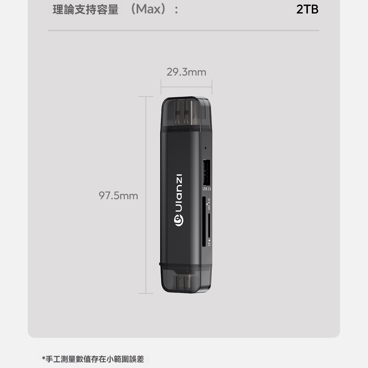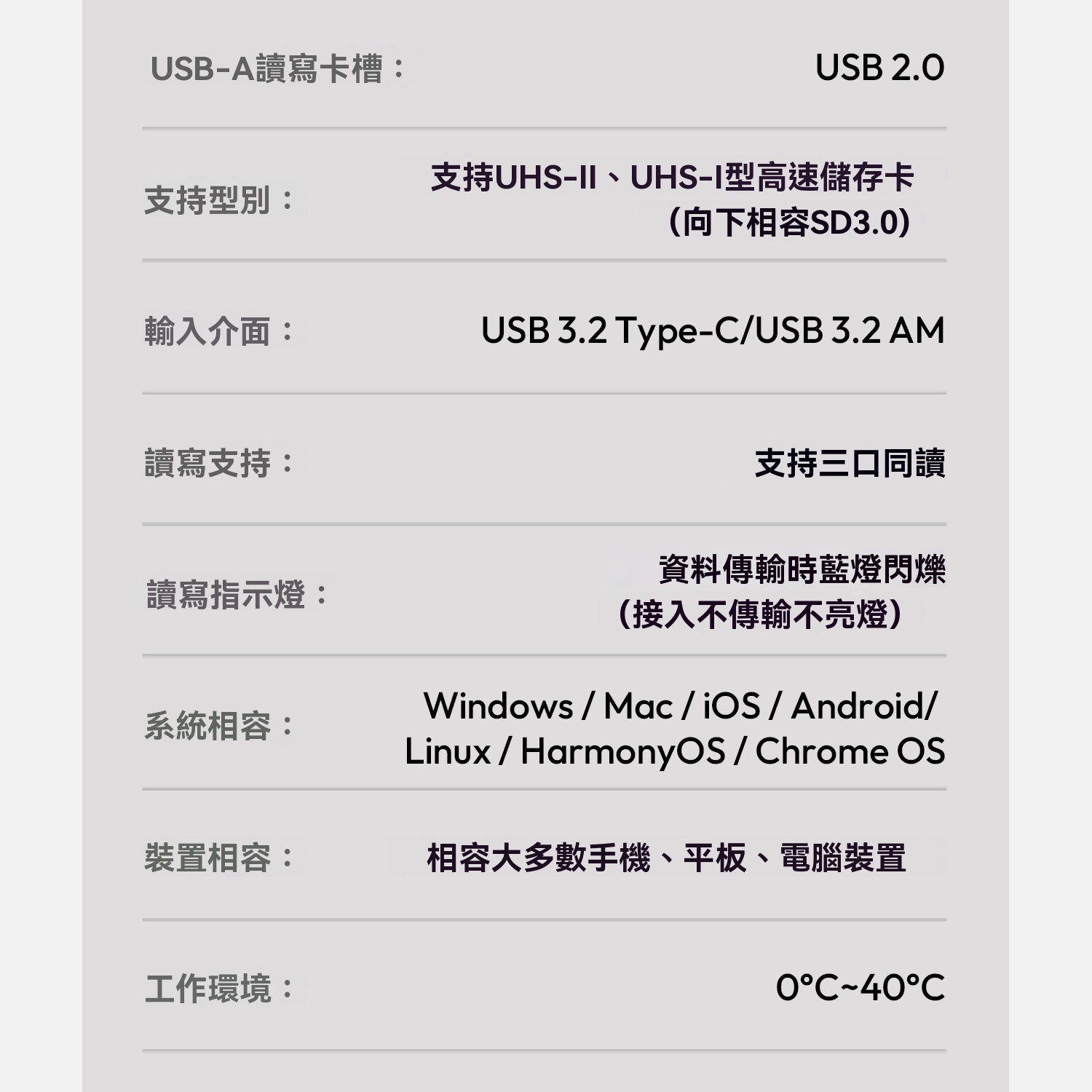 • 讀寫卡槽:SD4.0(理論傳輸速率312MB/s)、TF4.0(理論傳輸速率312MB/s)、USB 2.0 (USB-A)