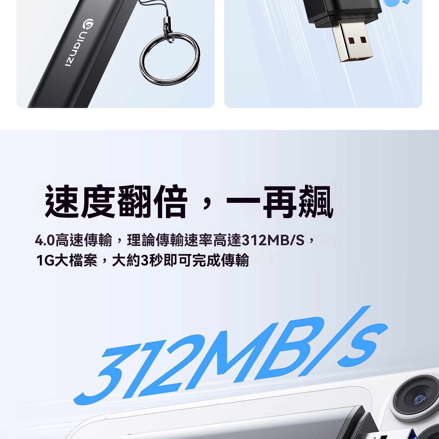 • 4.0高速傳輸,理論速率高達312MB/s,1G大檔案約3秒完成