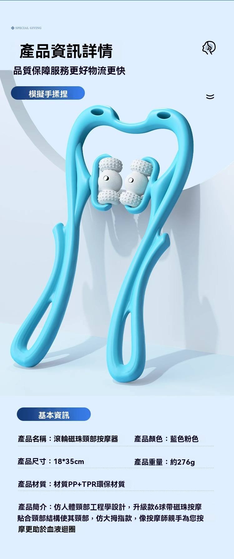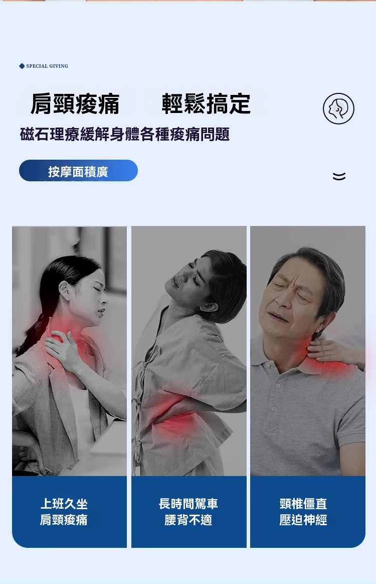 • 設計特點:仿人體頸部工程學設計、升級款6球帶磁珠按摩