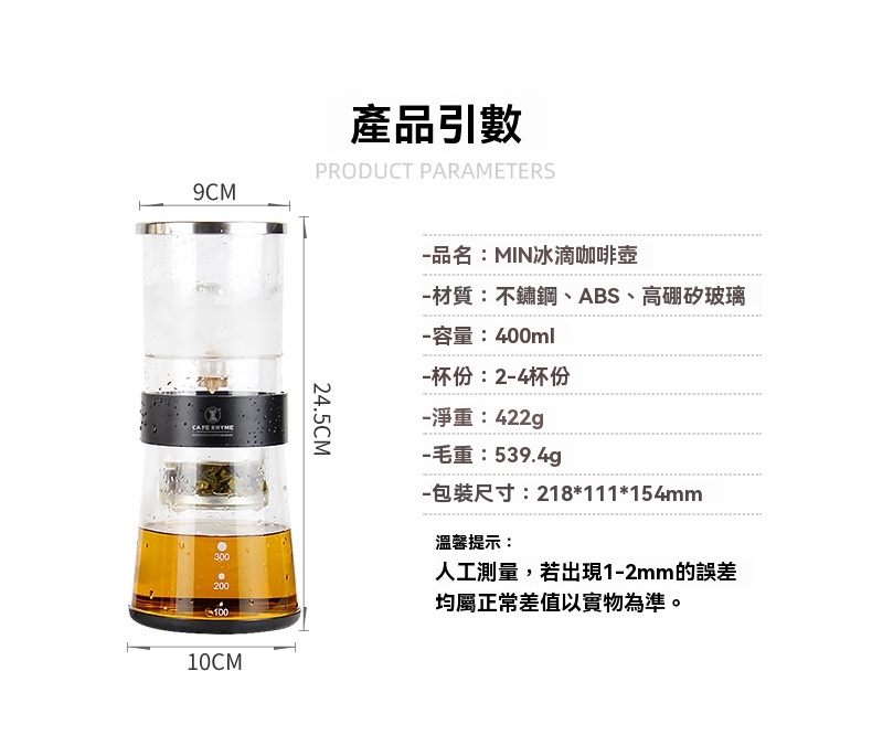 想在家輕鬆享受職人級的冰萃風味嗎?推薦這款冰滴咖啡壺,不僅能製作口感純淨的萃冰咖啡,也適合沖泡風味獨特的萃冰茶,一壺兩用。壺身採用高硼矽玻璃搭配不鏽鋼與ABS材質,堅固耐用且安全無毒。400ml 的容量約可沖泡 2-4 杯份,無論是個人獨享或與朋友分享都十分合適。產品淨重僅 422g,設計簡約俐落,非常適合居家或辦公室使用。現在就入手白色款,開啟您的慢萃生活。