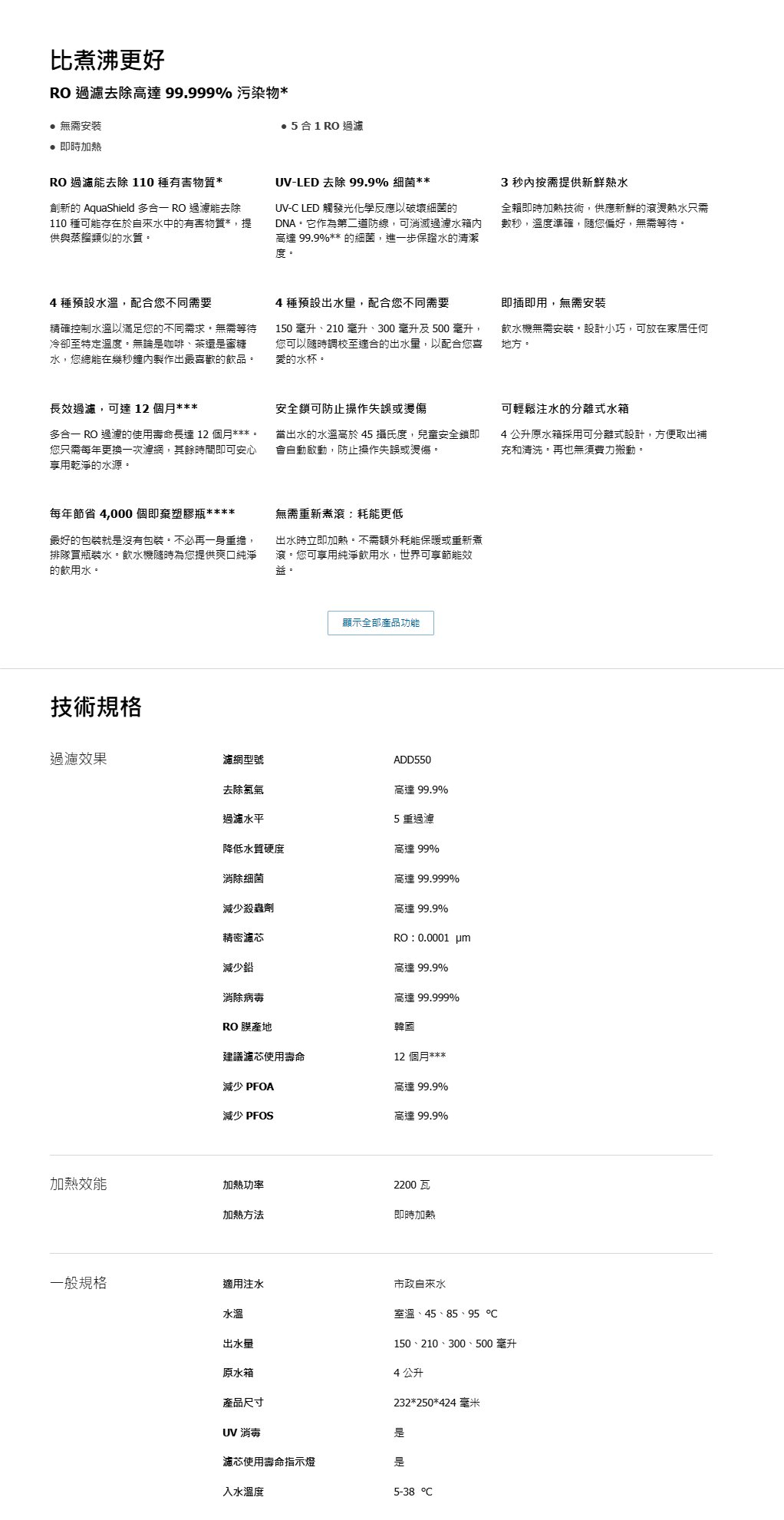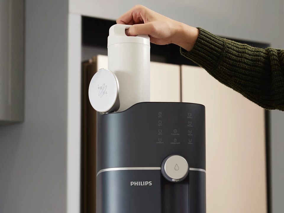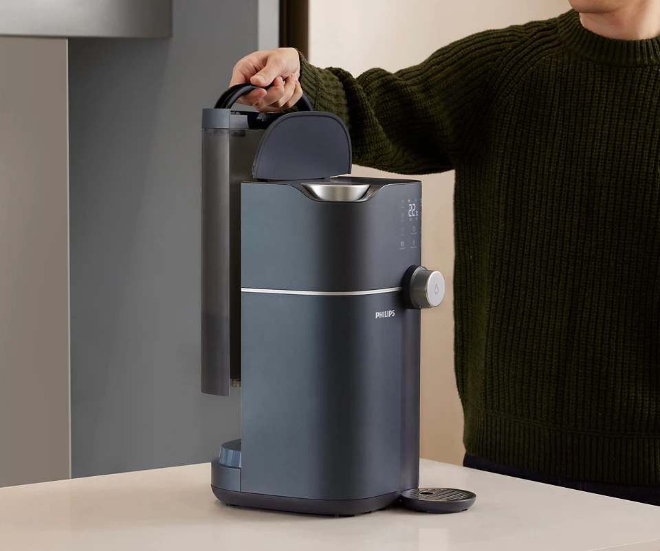 飛利浦 ADD6910DG/90 RO即熱式飲水機(黑色),結合逆滲透與即時加熱技術。其AquaShield RO過濾能去除110種有害物質( 101種由SGS/BV測試,9種由內部實驗室測試),UV-LED則可消滅99.9%細菌。無需安裝,即插即用,能在3秒內提供精確溫度的新鮮熱水,並設有4段水溫(室溫、45、85、95°C)與4段出水量選擇。配備4公升可拆式水箱,兒童安全鎖於水溫超過45°C時自動啟動,使用安心。濾芯壽命長達12個月*,節能且免去重複煮沸。