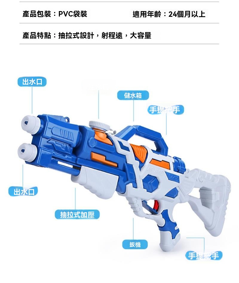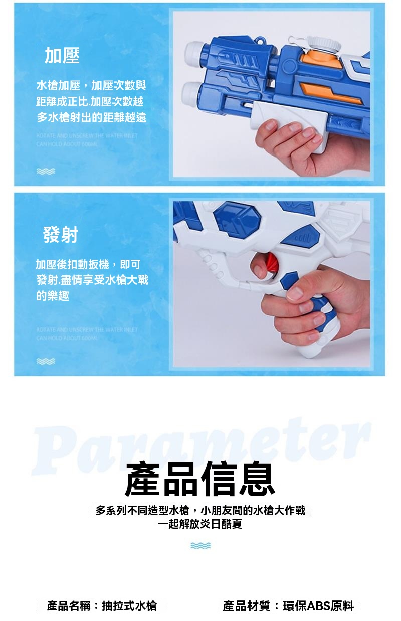 夏日玩水怎能少了這款抽拉式成人兒童高壓強力噴水玩具槍!它操作簡易,透過抽拉即可輕鬆加壓,帶來強勁水壓。槍身設計符合人體工學,大人小孩都能舒適握持。水箱擁有大容量,減少頻繁裝水的麻煩。採用優質環保材料製作,安全可靠,耐摔耐磨。其高壓強噴水功能,讓水柱射程超遠,無論是泳池嬉戲、戶外打水仗,還是漂流時增添樂趣,都能大顯身手,為你帶來清涼又刺激的夏日玩水體驗 。