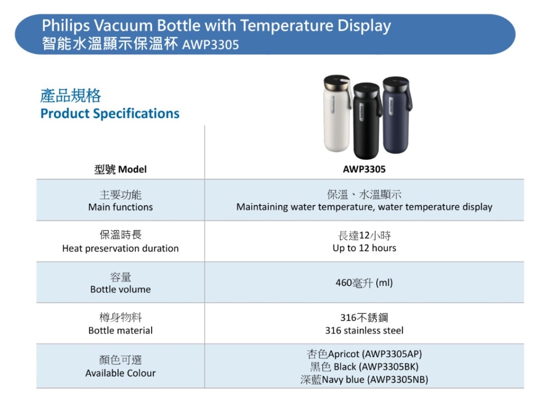 Buy Philips AWP3305BK/97 便攜保溫杯 - 黑色 | 智能水溫顯示 | 12小時長效保溫 | 香港行貨 price in outletexpress .com Hong Kong.In promotion and sale.