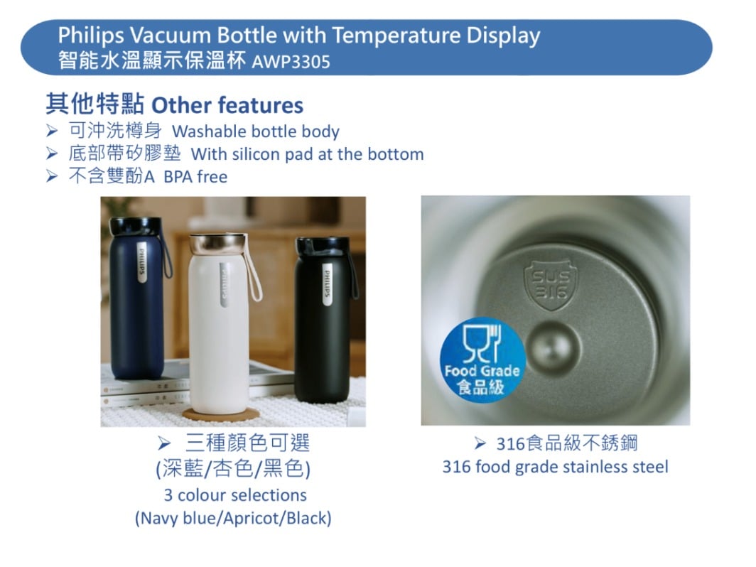 飛利浦 Philips AWP3305 智能水溫顯示 便攜保溫杯,智能水溫電量顯示,輕觸水溫顯示,USB Type-C 充電。三種顏色可選,纖細樽身,方便攜帶,12小時長效保溫。