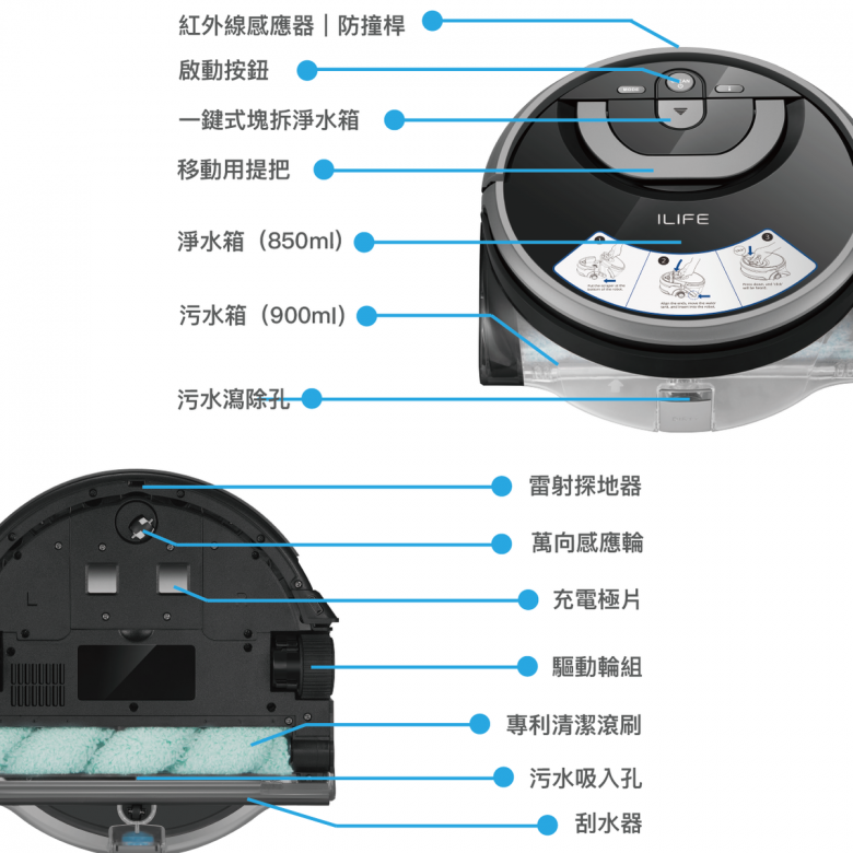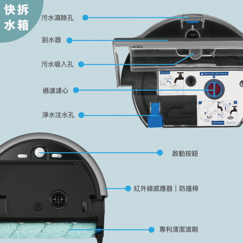 .ILIFE智意W400所採用的大容量淨污水箱分離設計,隨時確保只用淨水洗地,極大地提升了清潔效果。