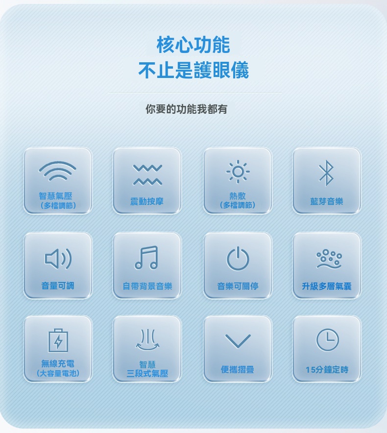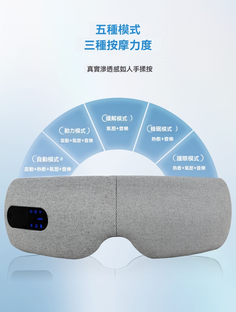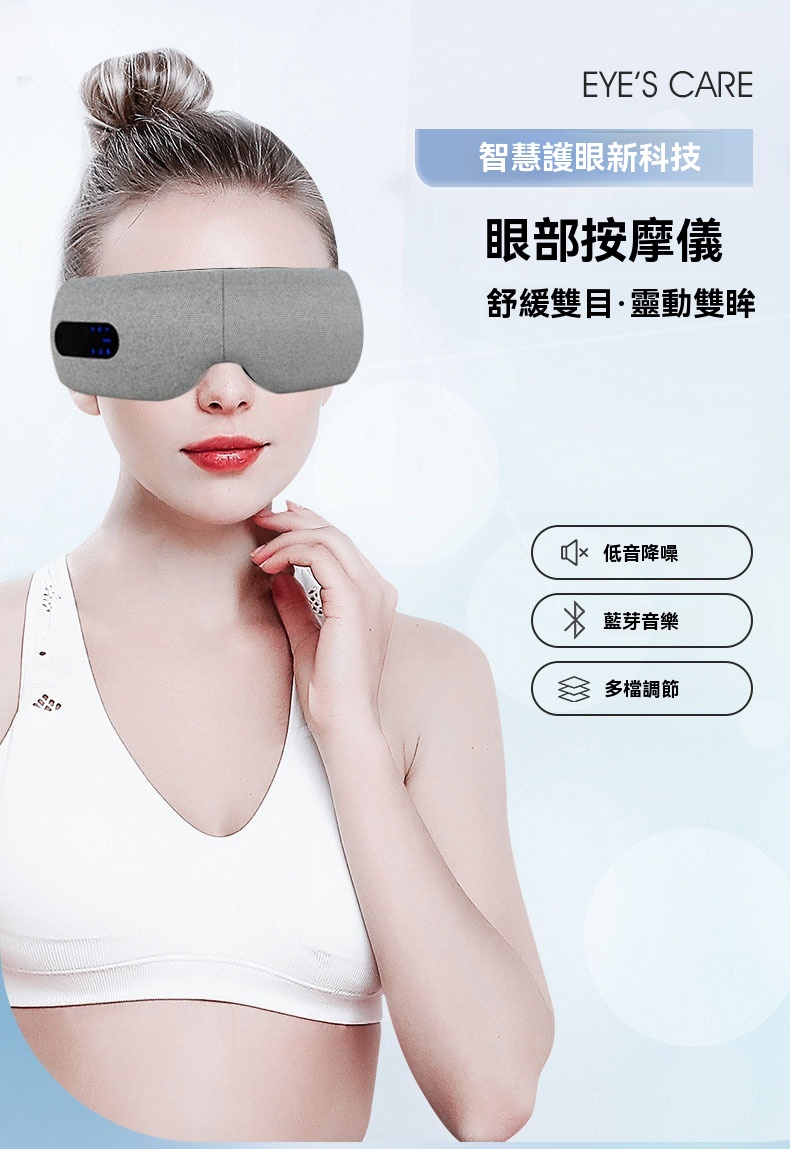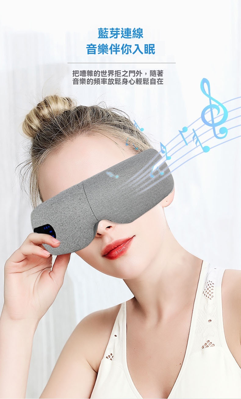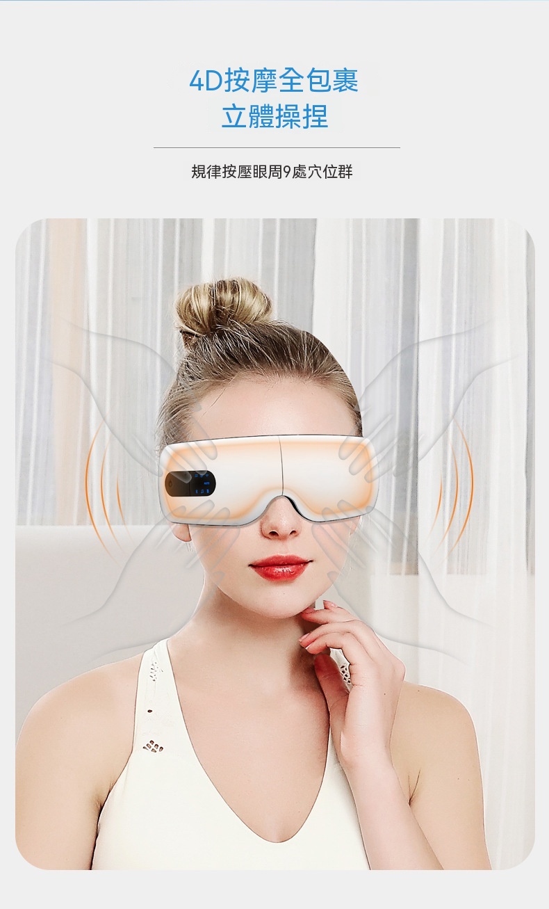 這款可折疊眼部按摩器專為長時間用眼的上班族、學生及熬夜族設計,集多種護眼功能於一體。產品採用智慧氣壓與多頻震動結合,規律按壓眼周九大穴位,帶來人手揉按般的真實滲透感。其三檔熱敷可均勻發熱,如同毛巾熱敷般緩解一天的乾澀;藍牙音樂功能支持音量調節與音樂關停,幫助你在舒緩節奏中放鬆身心。按摩器選用柔軟親膚的蛋白皮材質,易於清洗,並配有可調式卡扣以適應不同頭型。內建1600mAh大容量電池,支援無線充電,一次充滿可累計使用約100分鐘。提供五種模式與三檔按摩力度,無論是氣壓+音樂的緩解模式,或是震動+熱敷+氣壓的自動護眼模式,皆可依需求調整。其可折疊設計便於攜帶,配合15分鐘智能定時,讓你隨時享受專業眼部護理。