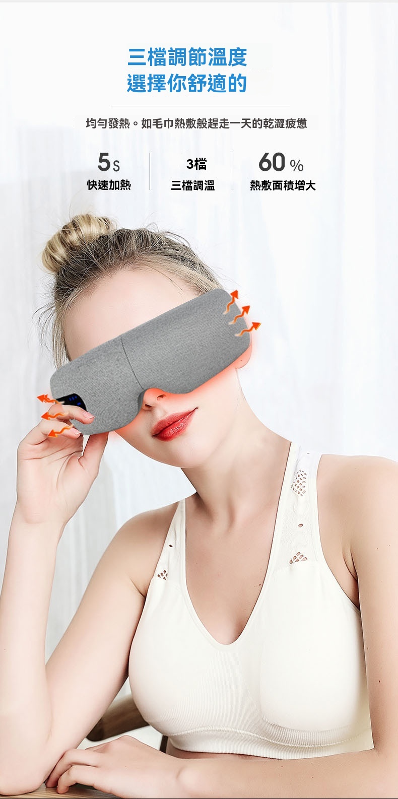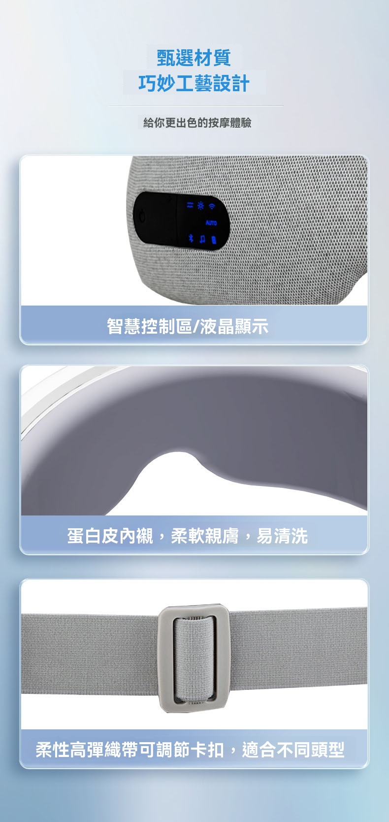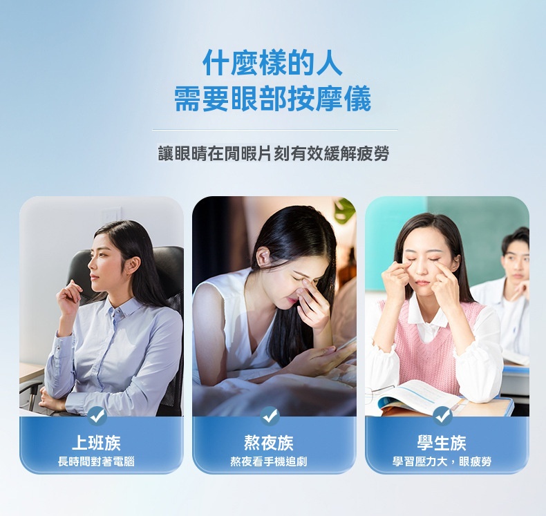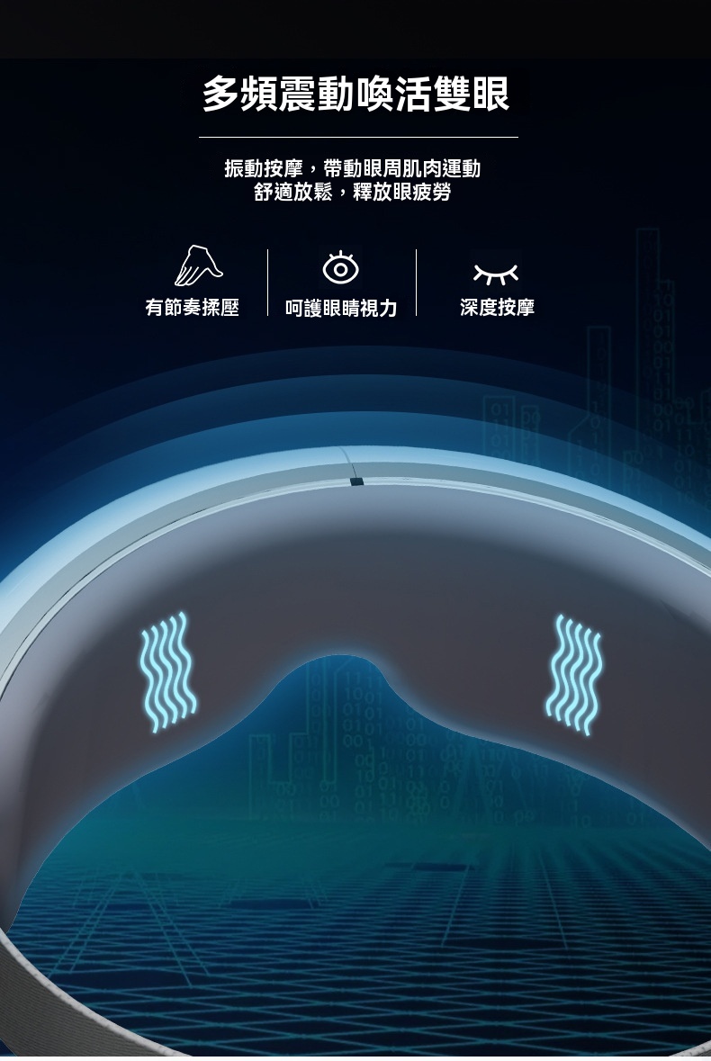 這款可折疊眼部按摩器專為長時間用眼的上班族、學生及熬夜族設計,集多種護眼功能於一體。產品採用智慧氣壓與多頻震動結合,規律按壓眼周九大穴位,帶來人手揉按般的真實滲透感。其三檔熱敷可均勻發熱,如同毛巾熱敷般緩解一天的乾澀;藍牙音樂功能支持音量調節與音樂關停,幫助你在舒緩節奏中放鬆身心。按摩器選用柔軟親膚的蛋白皮材質,易於清洗,並配有可調式卡扣以適應不同頭型。內建1600mAh大容量電池,支援無線充電,一次充滿可累計使用約100分鐘。提供五種模式與三檔按摩力度,無論是氣壓+音樂的緩解模式,或是震動+熱敷+氣壓的自動護眼模式,皆可依需求調整。其可折疊設計便於攜帶,配合15分鐘智能定時,讓你隨時享受專業眼部護理。