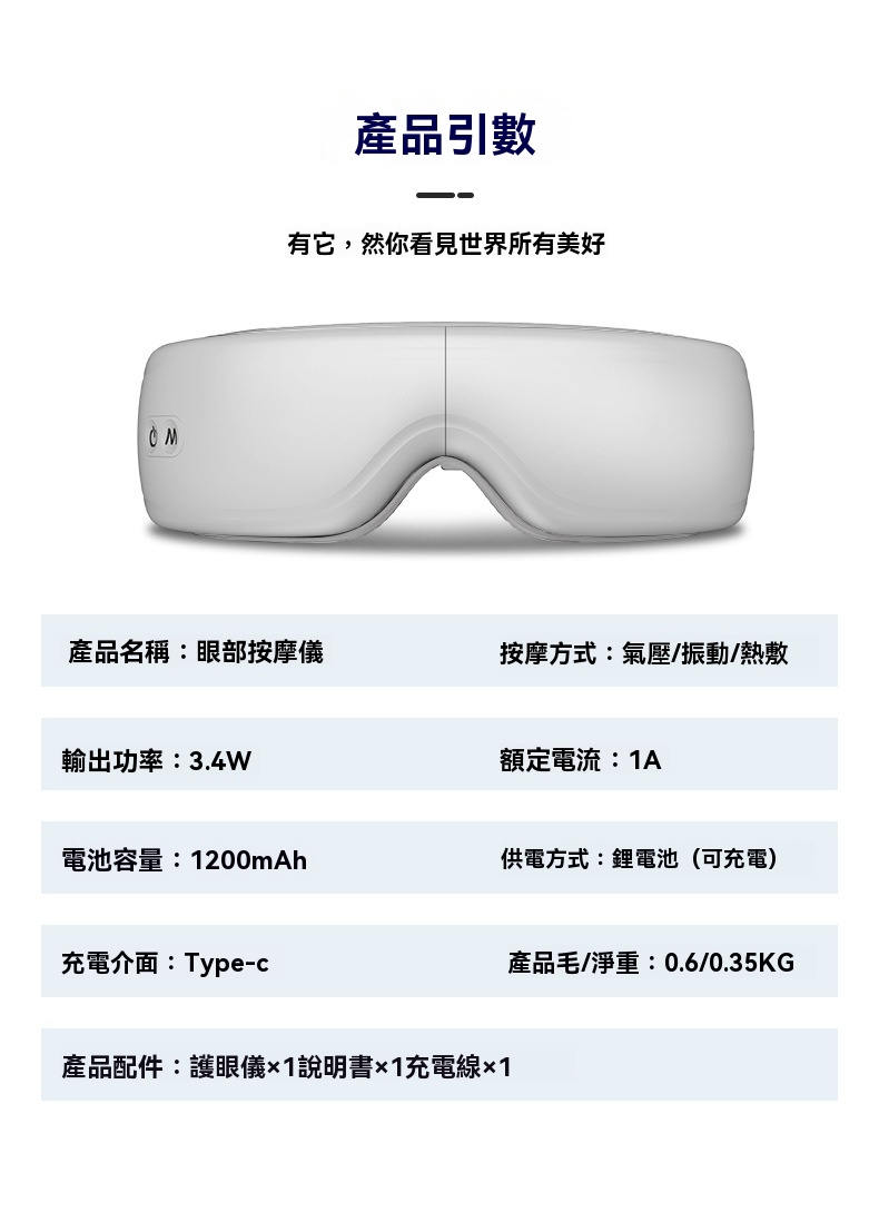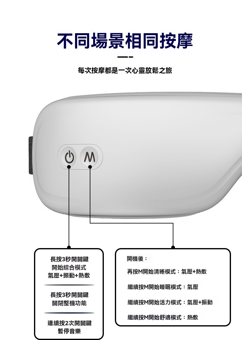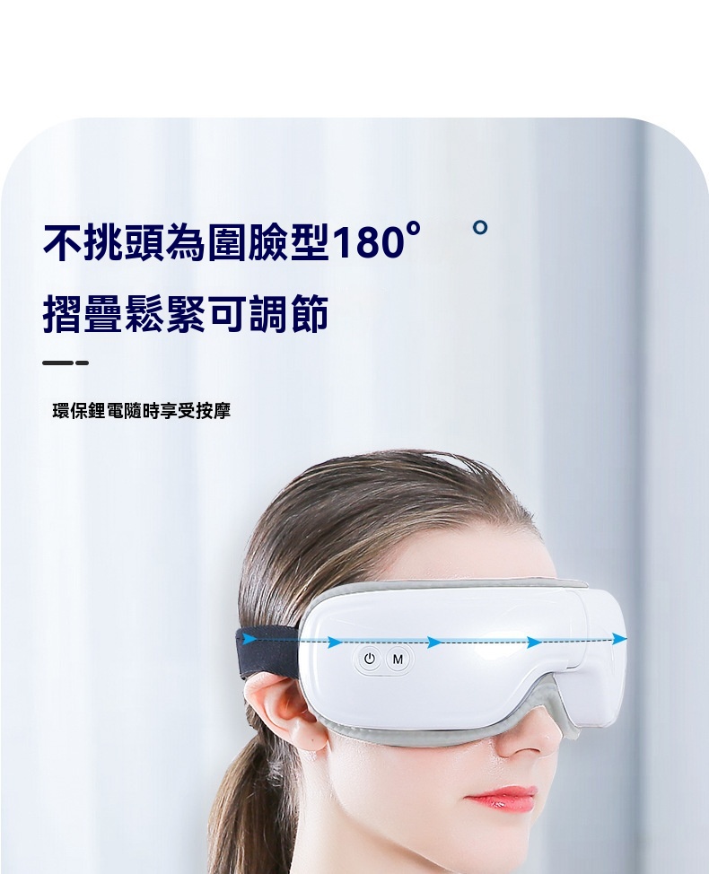眼部按摩器專為用眼過度的「屏奴」族群設計,每天15分鐘深層放鬆雙眼。搭載32D氣囊搭配多頻率震動,精確揉捏眼部穴位,並提供42℃恆溫熱敷,有效緩解眼乾、疲勞及視力模糊。產品配備5大按摩模式(如綜合、清晰、睡眠等),可透過一鍵切換滿足辦公、睡前等差異化場景。內置1200mAh環保鋰電池,支援Type-C充電,且機身可180°摺疊調節,適應多種臉型。更支援藍牙音樂播放,讓每一次按摩都成為心靈放鬆之旅。