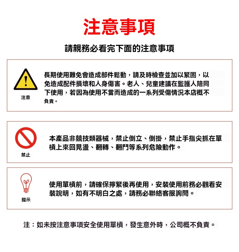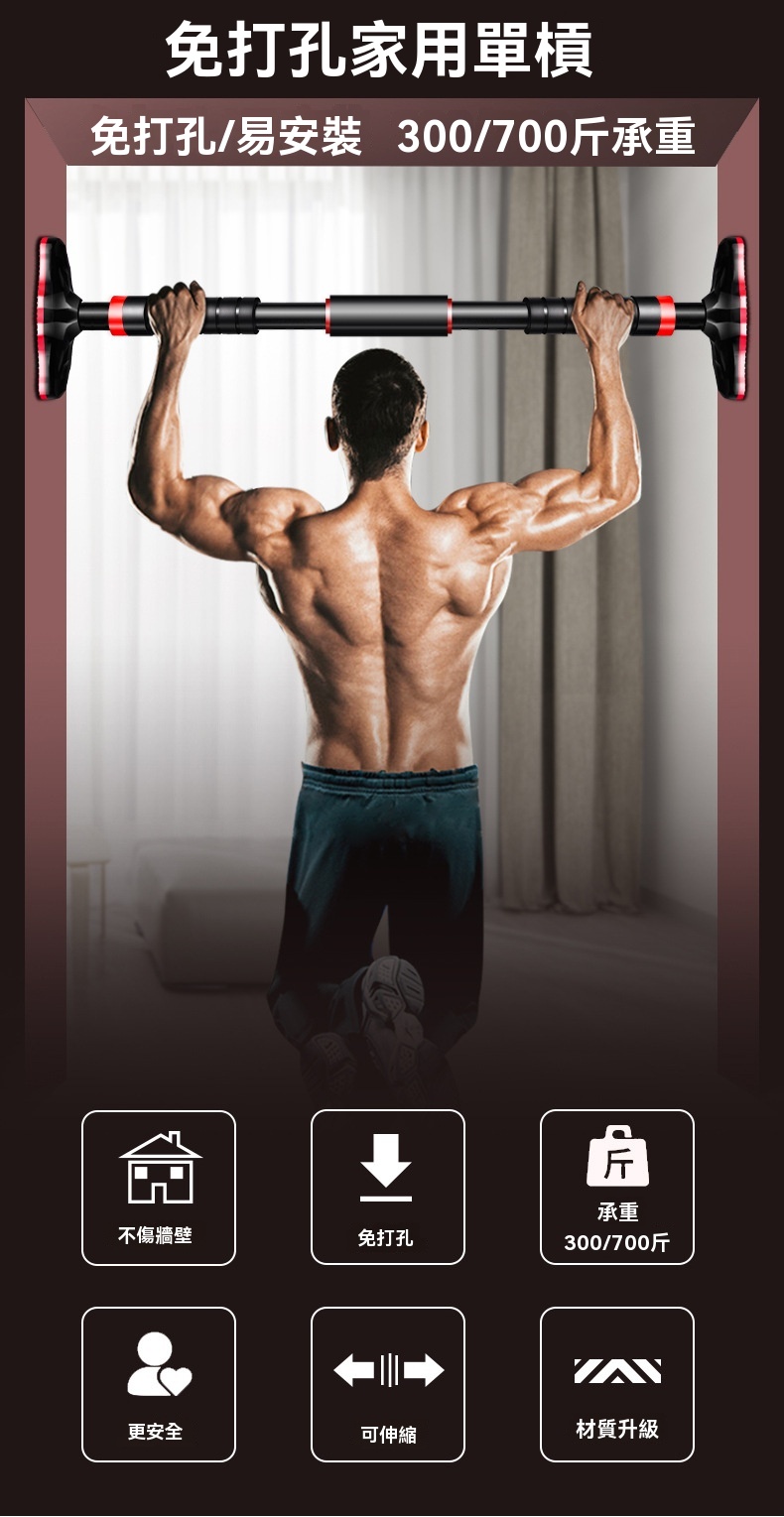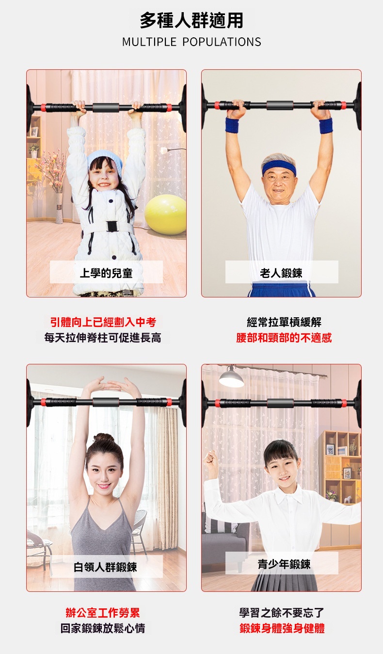 這款免打孔家用引體上升橫桿單槓,專為居家健身設計,採用免打釘安裝,不傷牆面與門框,承重分別達300及700斤,安全穩固。產品適用70至95cm伸縮距離,安裝只需30秒,旋轉延長即可撐緊。升級加大底座搭配32條防滑橫條,加大接觸面更牢固;齒輪鎖卸結構與加厚銅管增強耐用性。握把採用防滑泡棉,舒適吸汗。適合多種人群,包括青少年、白領及長者,但需注意避免安裝於空心門或玻璃門,使用前請確保撐緊並詳閱說明,避免危險動作。