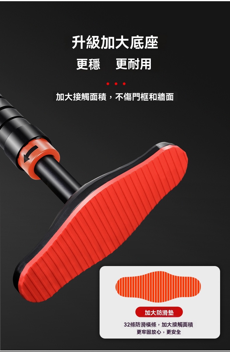 • 加大底座防滑墊,穩固耐用:底座採用加大接觸面設計,搭配32條防滑橫條,有效防止滑動,同時保護門框不受磨損。