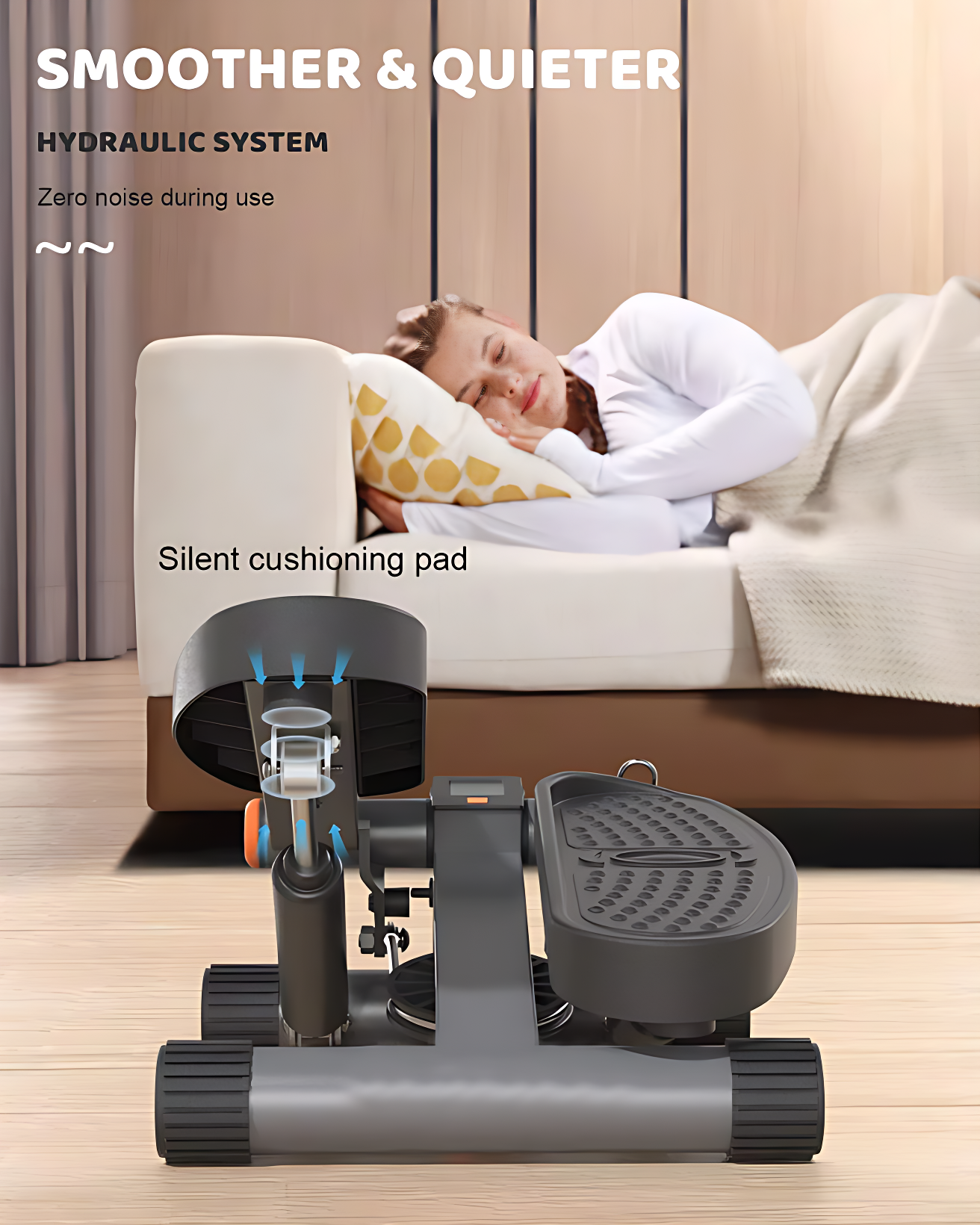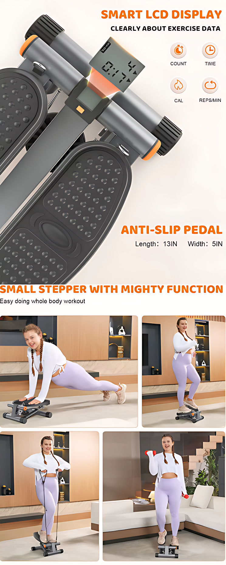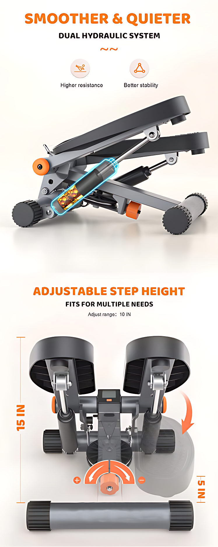 這款多功能液壓踏步機 - 黑色,搭載雙液壓系統,實現近乎零噪音的靜音運作,並提供更高的阻力與穩定性。其可調節步高設計(調節範圍達10英寸),能滿足不同強度的鍛煉需求。主體採用1.5MM商用鋼材製成,具備300LBS的强大承重能力。配備智能LCD顯示屏,能清晰顯示次數、時間、卡路里及步頻,讓運動數據一目瞭然。防滑踏板(長13英寸,寬5英寸)確保動作安全。產品無需安裝,輕便易攜,不僅能鍛煉臀部與腿部線條,搭配彈力帶還可進行全身訓練,是減脂塑形的理想選擇。