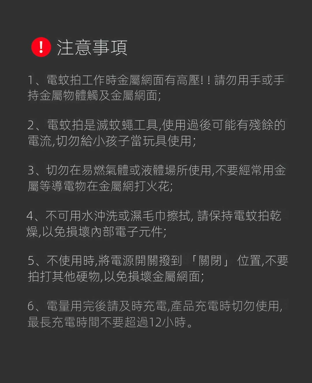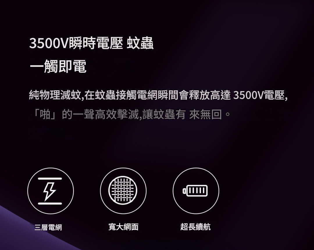 • 瞬時高壓電擊:3500V瞬時電壓,迅速消滅蚊蟲。