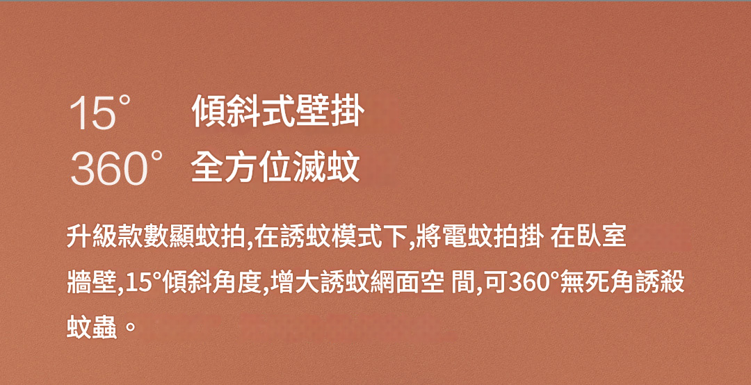 • 傾斜式壁掛設計:15°傾斜角度增大誘蚊網面積。