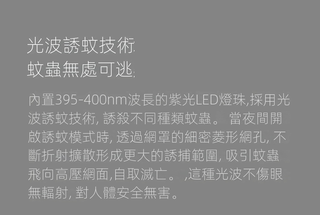 • 光波誘蚊技術:內置395-400nm波長的紫外LED燈珠,吸引各類蚊蟲。