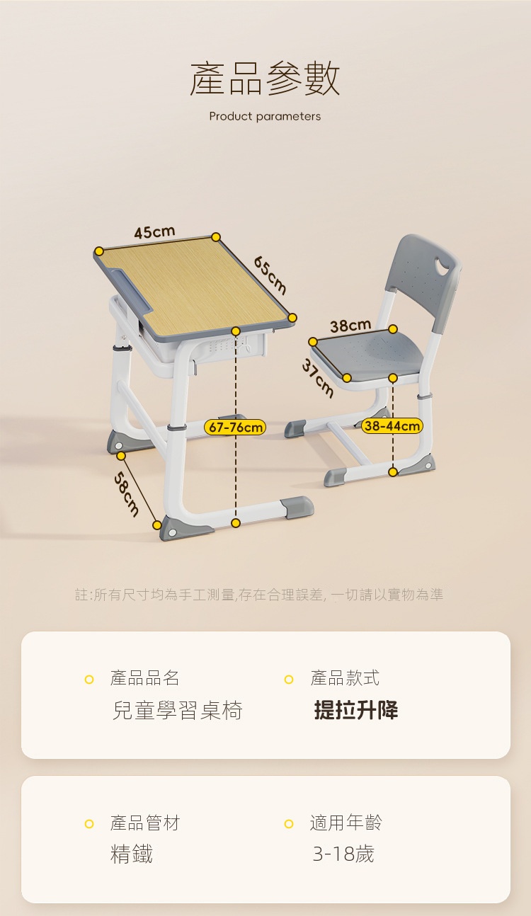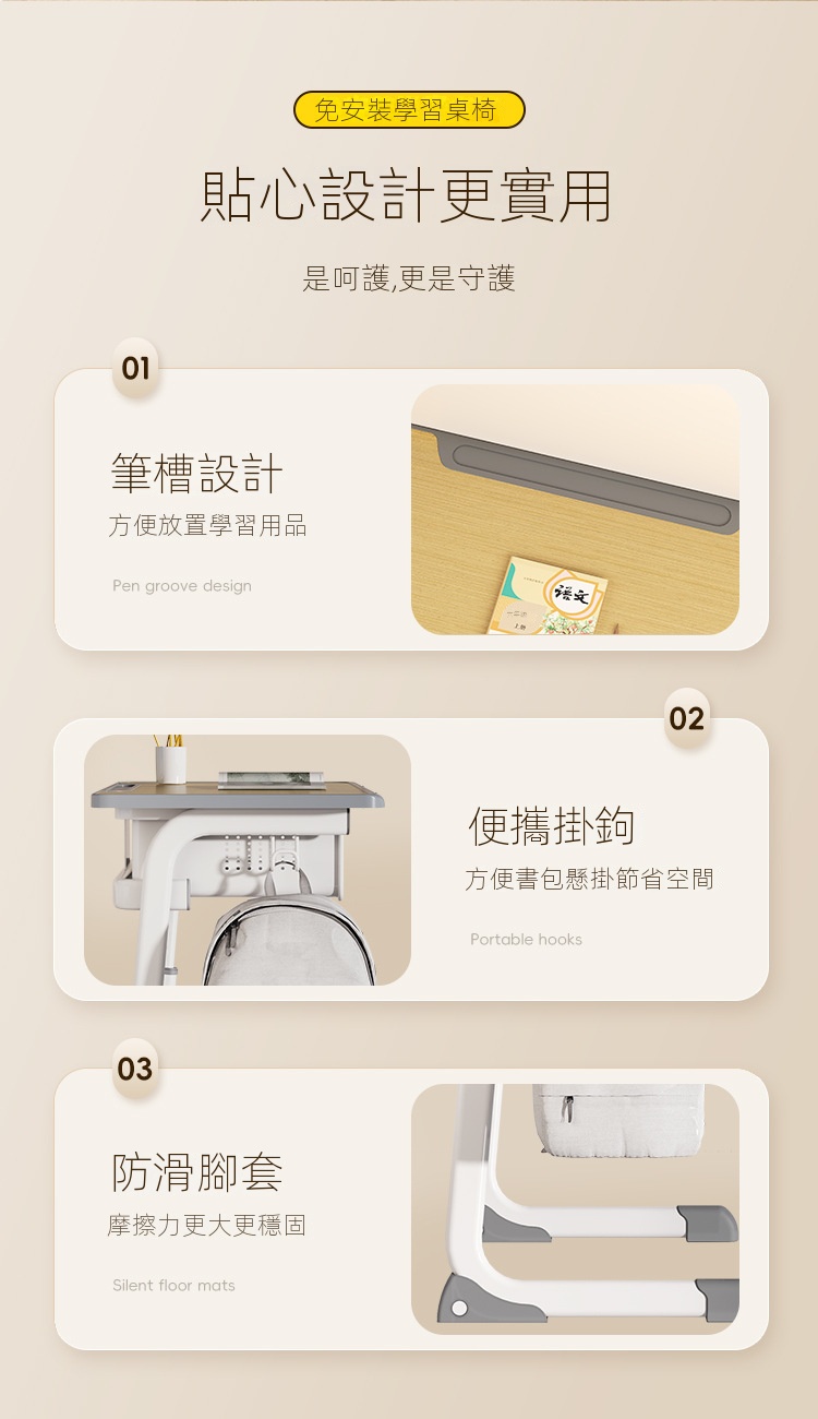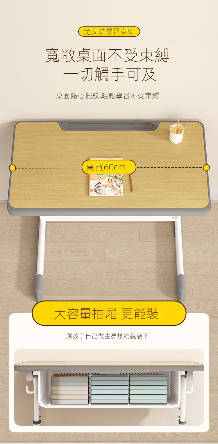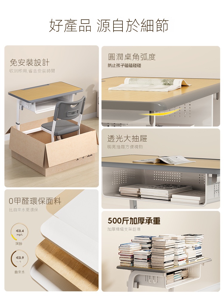 兒童可升降學習書桌套裝,免安裝即用,採用桌椅提拉升降,適合3-18歲不同年齡段使用。C型結構無擋腳設計,膝蓋自然彎曲90°,腳與地面呈90°,弧形椅面貼合腰背,端正坐姿。桌角圓潤,大抽屜透光方便視物,0甲醛環保面料,健康無味。桌面寬敞,可擦洗桌面抗菌抗污。