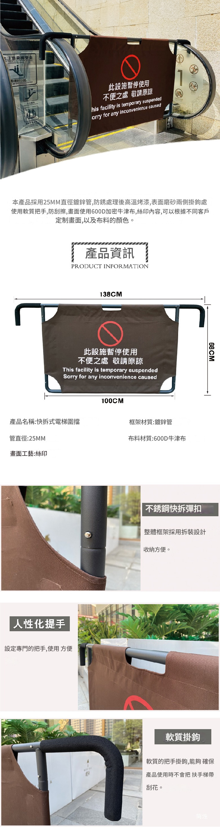 這款摺疊電梯圍欄是一款專為安全設計的創新產品,適合各種環境使用。其人性化提手設計,讓您在使用過程中更加方便,無論是安裝還是收納都極為簡單。整體框架採用不銹鋼快拆彈扣,讓您能輕鬆拆裝,便於存放,節省空間。此外,獨特的軟質掛鉤設計,能有效防止刮花扶手梯,確保使用過程中的安全和美觀。這款圍欄不僅功能強大,還能為您的電梯空間增添一份安全感,是您提升防護的理想選擇。