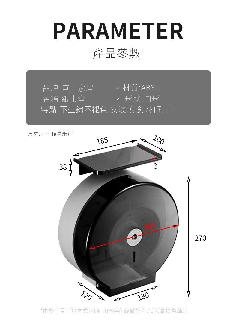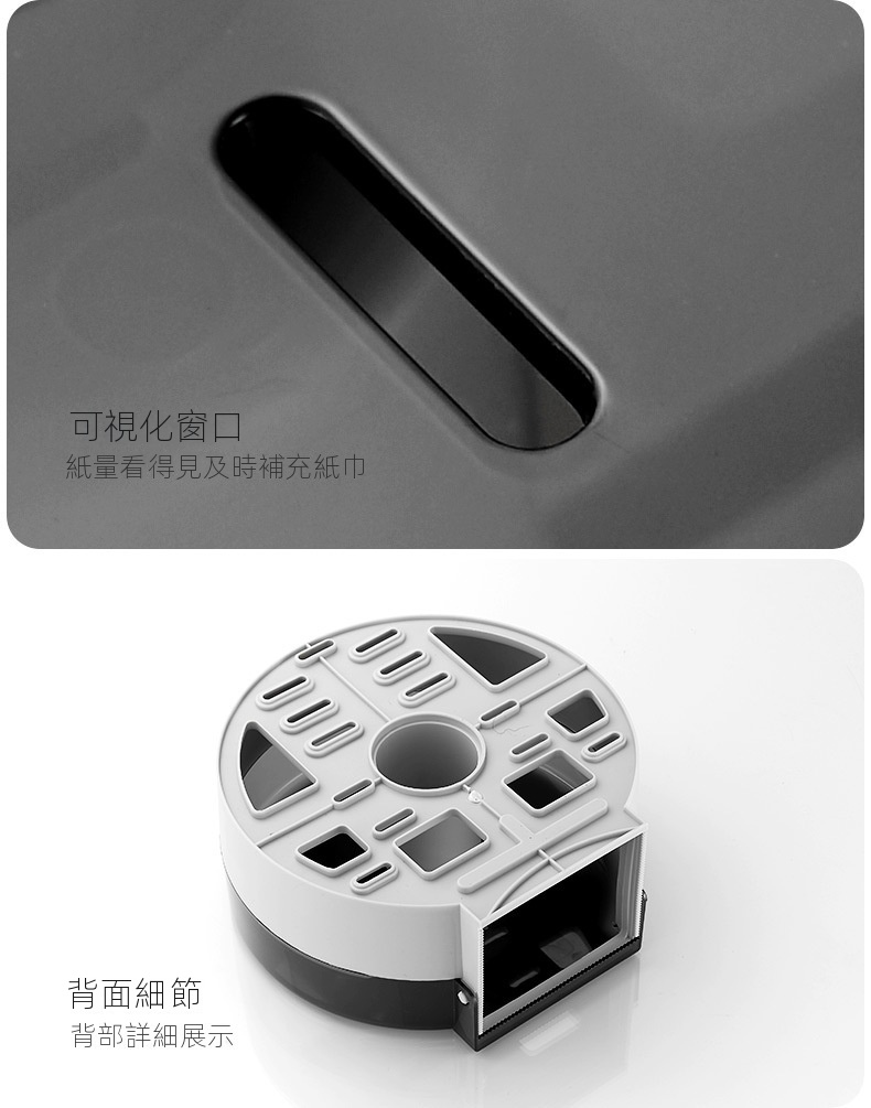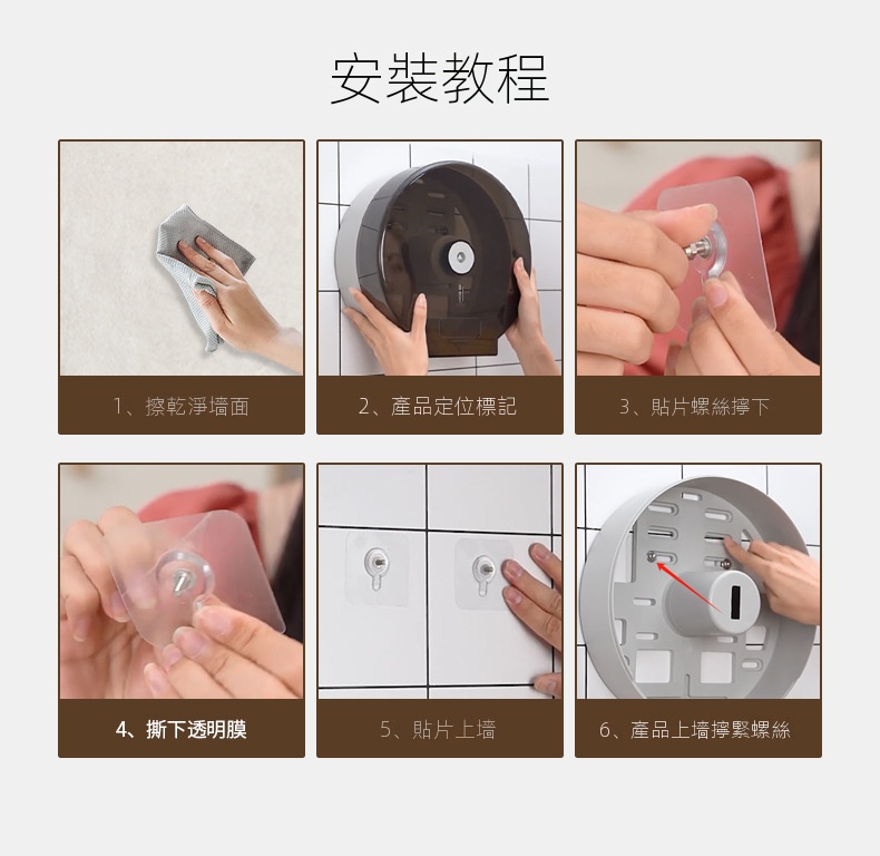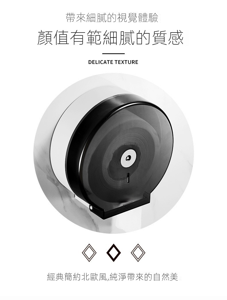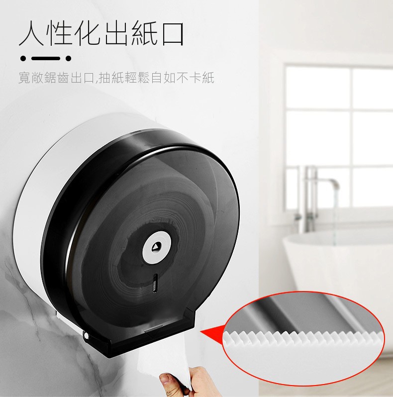 壁掛式透明塑膠大卷紙巾架,具備不生鏽、不褪色特性。人性化鋸齒出紙口,抽紙順暢不卡紙,並配有可視化紙量窗口,及時補充紙巾。一體成型設計,質感細膩圓潤不傷手。免釘安裝,保護牆面不受損,適合學校、醫院、商業場所等多種場景使用。客戶需要自行安裝產品。