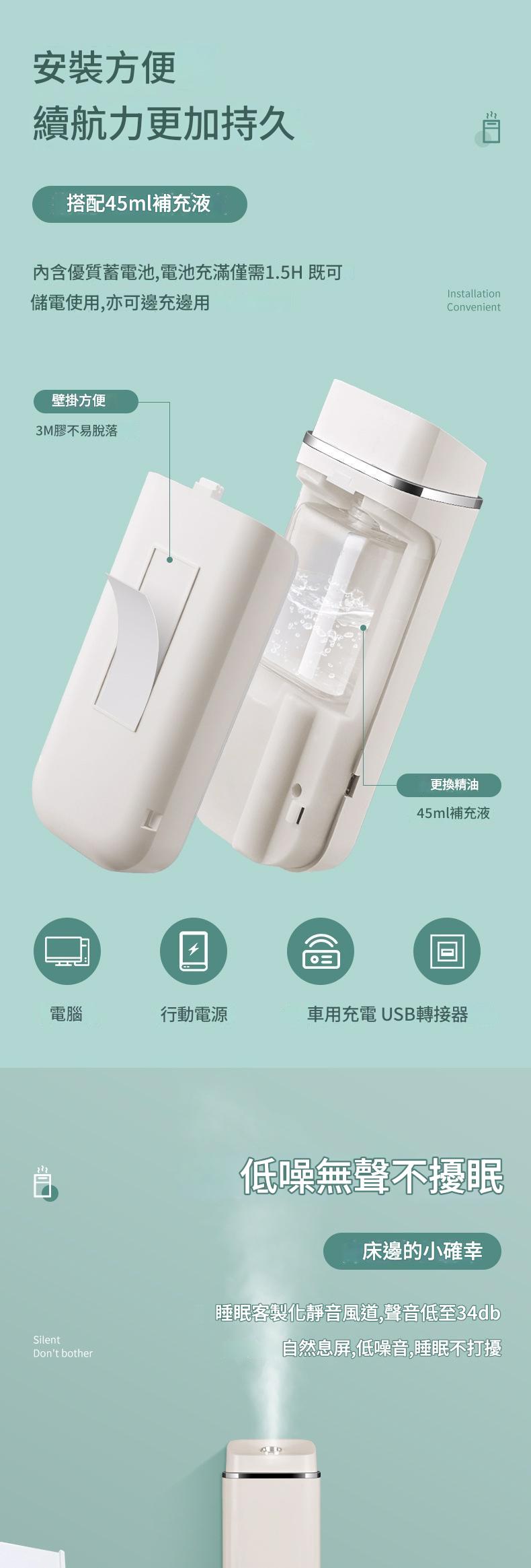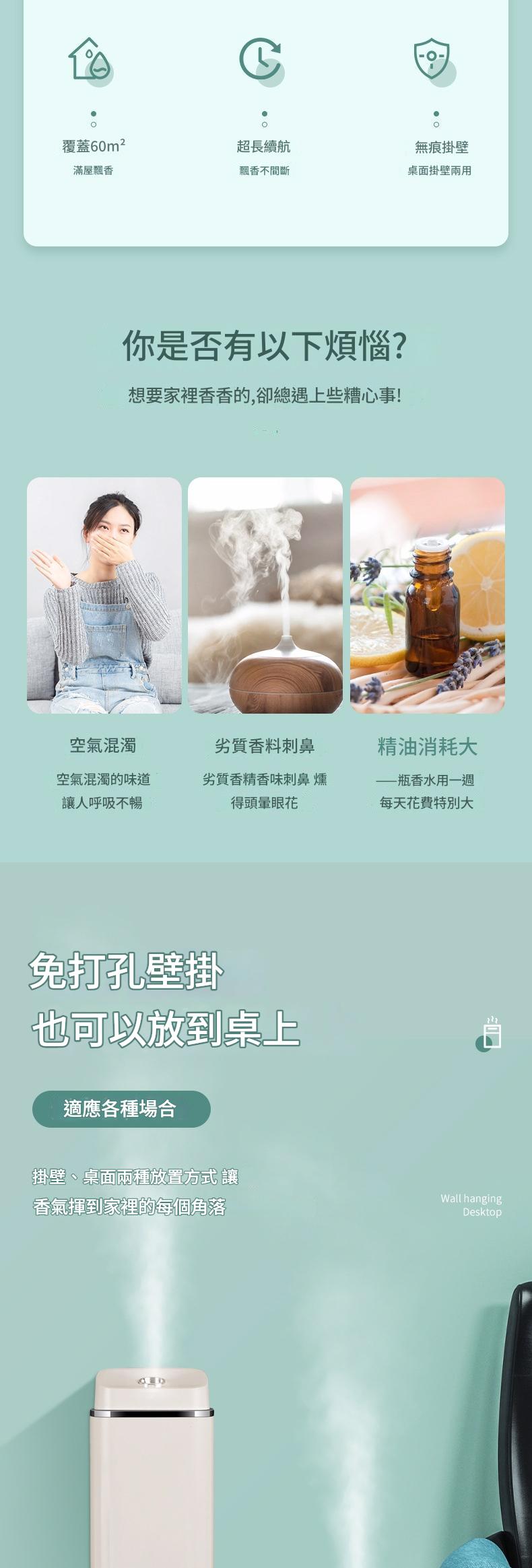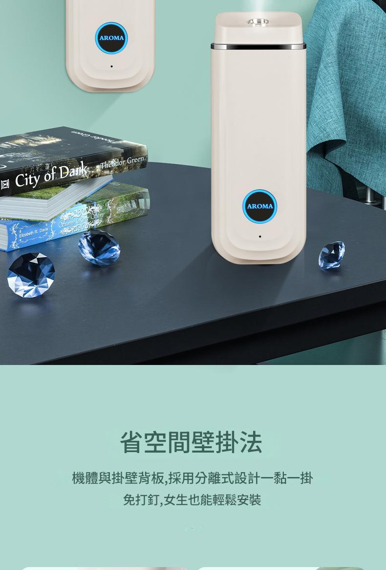 免打孔壁掛式自動噴香機是一款便利的居家與商用香氛設備。它採用無痕背膠設計,安裝簡單,不損壞牆面。機身小巧,適合衛生間、飯店走廊等小面積空間,有效去除異味,並擴散香氛。部分產品支援自動噴香和定時功能,可依需求調節噴香頻率。 ,內建蓄電池,充滿只需1.5H,插電供電,維護方便。其智慧設計和多樣化香型選擇,讓空間時刻保持清新與舒適。