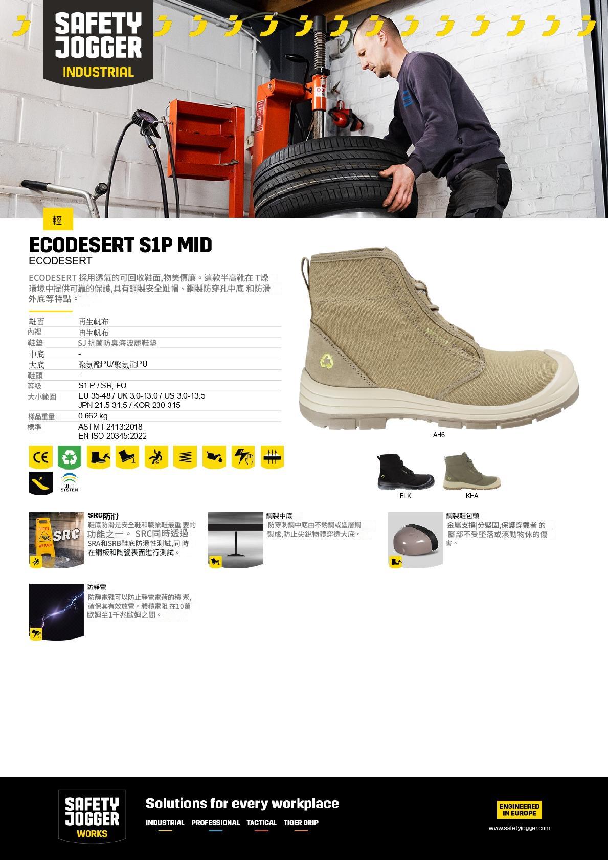 DESERT S1P 安全靴的永續發展繼承者。 ECODESERT 採用透氣的可回收鞋面材料,以更少的材料提供更多的功能。這款半高靴在乾燥環境中提供可靠的保護,具有鋼製鞋頭帽、鋼製穿孔中底和防滑外底等特點。此外,這款安全鞋還具有防靜電功能,並在鞋跟處提供能量吸收功能。 ECODESERT 鞋型寬大,為您的雙腳提供充足的空間。