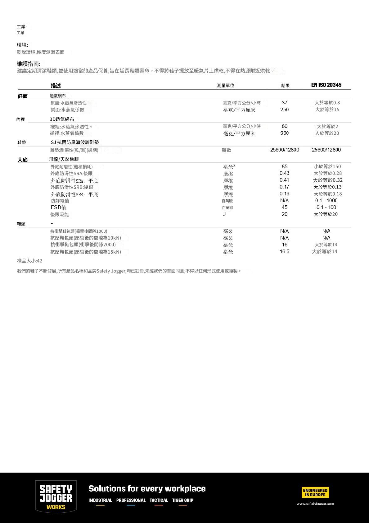 SAFETY JOGGER ABSOLUTE S1P 200891 中筒防靜電安全鞋,是專為混合工作場所設計的高筒鞋。這款鞋採用奈米碳包頭,超輕且堅固,能有效防止砸傷和刺穿。鞋面由透氣網布製成,內裡為3D透氣網布鞋墊,搭配SJ抗菌防臭海波麗鞋墊,確保腳部乾爽舒適。中底使用超高分子量聚乙烯防彈材質,大底為飛龍/天然橡膠,耐磨防滑,適合乾燥及濕滑環境。其內建空氣循環系統和減震功能,使鞋子輕盈舒適,是市面上最輕的安全鞋之一。此外,該鞋還具備防靜電功能,可防止靜電損壞電子元件及引發點火風險,體積電阻在10萬歐姆至35千兆歐姆之間。