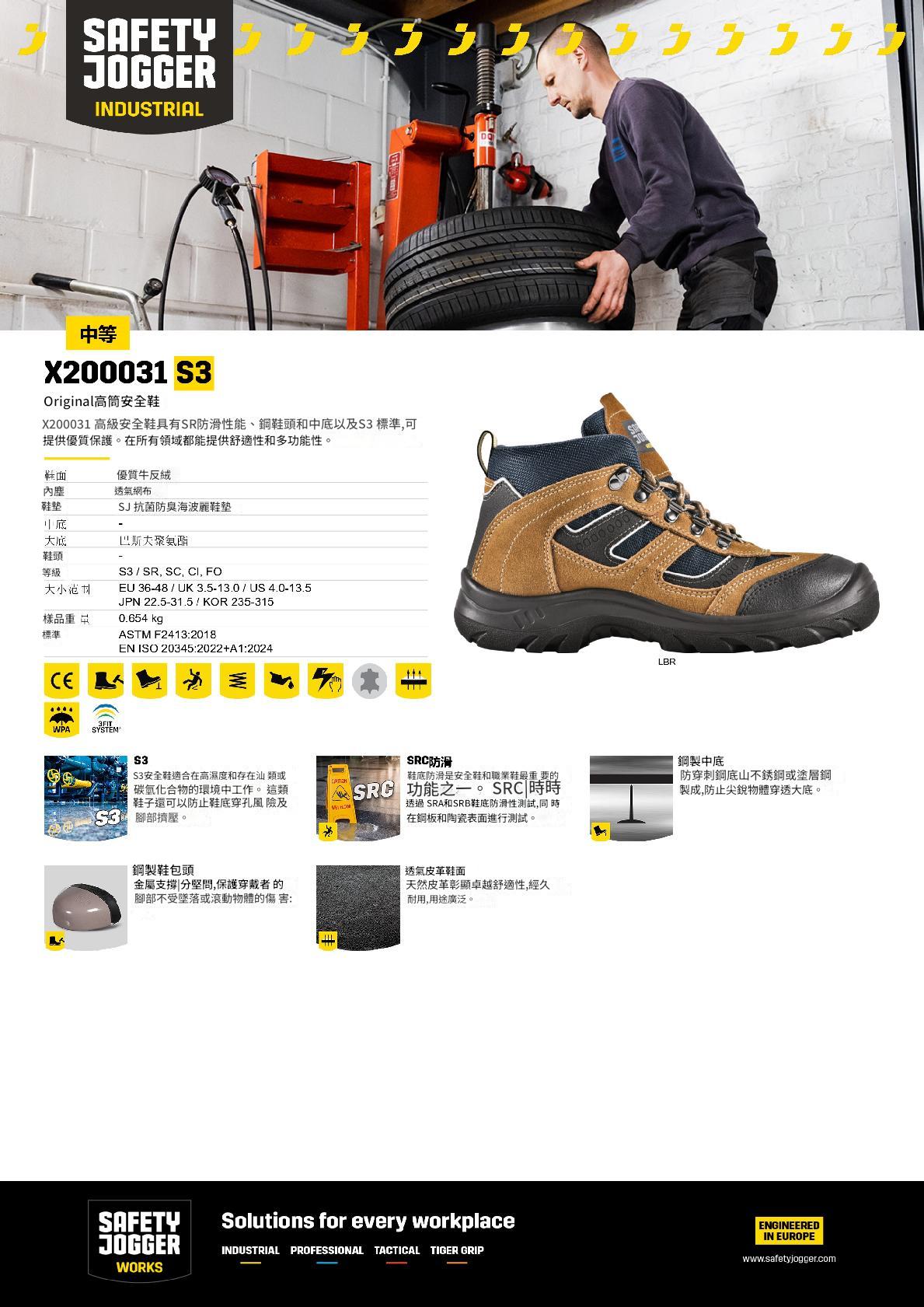 SAFETY JOGGER X200031 S3 高筒安全鞋,具備卓越防護性能。其鋼製鞋頭與中底,有效抵禦墜落物與尖銳物傷害。 SR防滑鞋底,適應高濕度與油污環境,防止滑倒​​。透氣皮革鞋面,確保舒適穿著,適合汽車、建築等行業。符合S3標準,提供全面保護,是高風險作業的理想選擇。