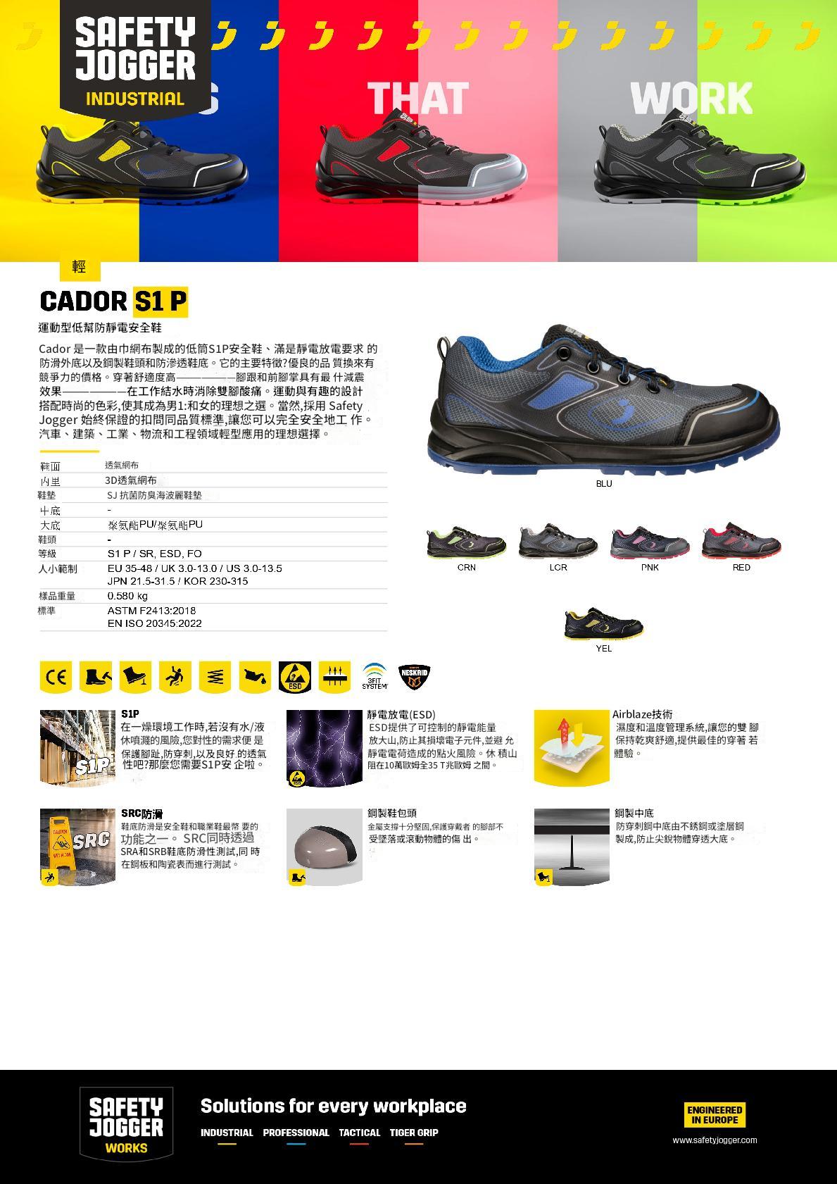 Cador 是一款由網布製成的低筒 S1P 安全鞋、滿足靜電放電要求的防滑外底以及鋼製鞋頭和防滲透鞋底。它的主要特徵?優良的品質換來有競爭力的價格。穿著舒適度高-腳跟和前腳掌具有最佳減震效果-在工作日結束時消除雙腳酸痛。運動和有趣的設計搭配時尚的色彩,使其成為男士和女士的理想之選。當然,採用Safety Jogger 始終保證的相同品質標準,讓您可以完全安全地工作。汽車、建築、工業、物流和工程領域輕型應用的理想選擇。