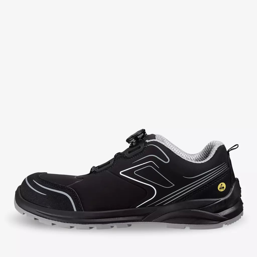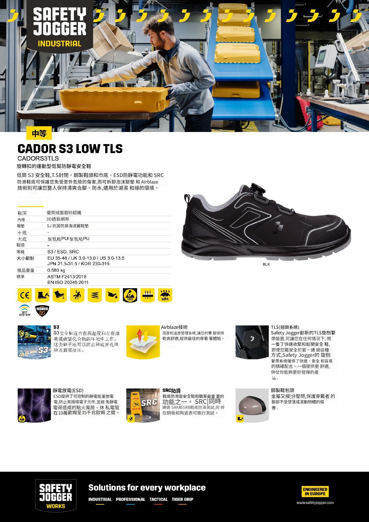 SAFETY JOGGER CADOR S3 LOW TLS 011254 ESD低筒安全鞋,集時尚與安全於一身。其採用優質絨面磨砂超纖鞋面,搭配3D透氣網佈內裡,舒適透氣。鋼製鞋頭和中底,提供堅固保護,防止腳部受擠壓和刺穿。 ESD防靜電功能,有效避免靜電引發的危險。 SRC防滑外底,經過嚴格測試,確保在各種地面的穩定性。獨特的TLS旋鈕繫帶裝置,單手即可快速調節,方便快速。此外,鞋頭與鞋身反光設計,夜間作業更安全。