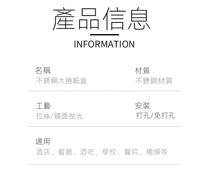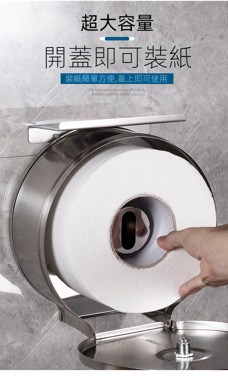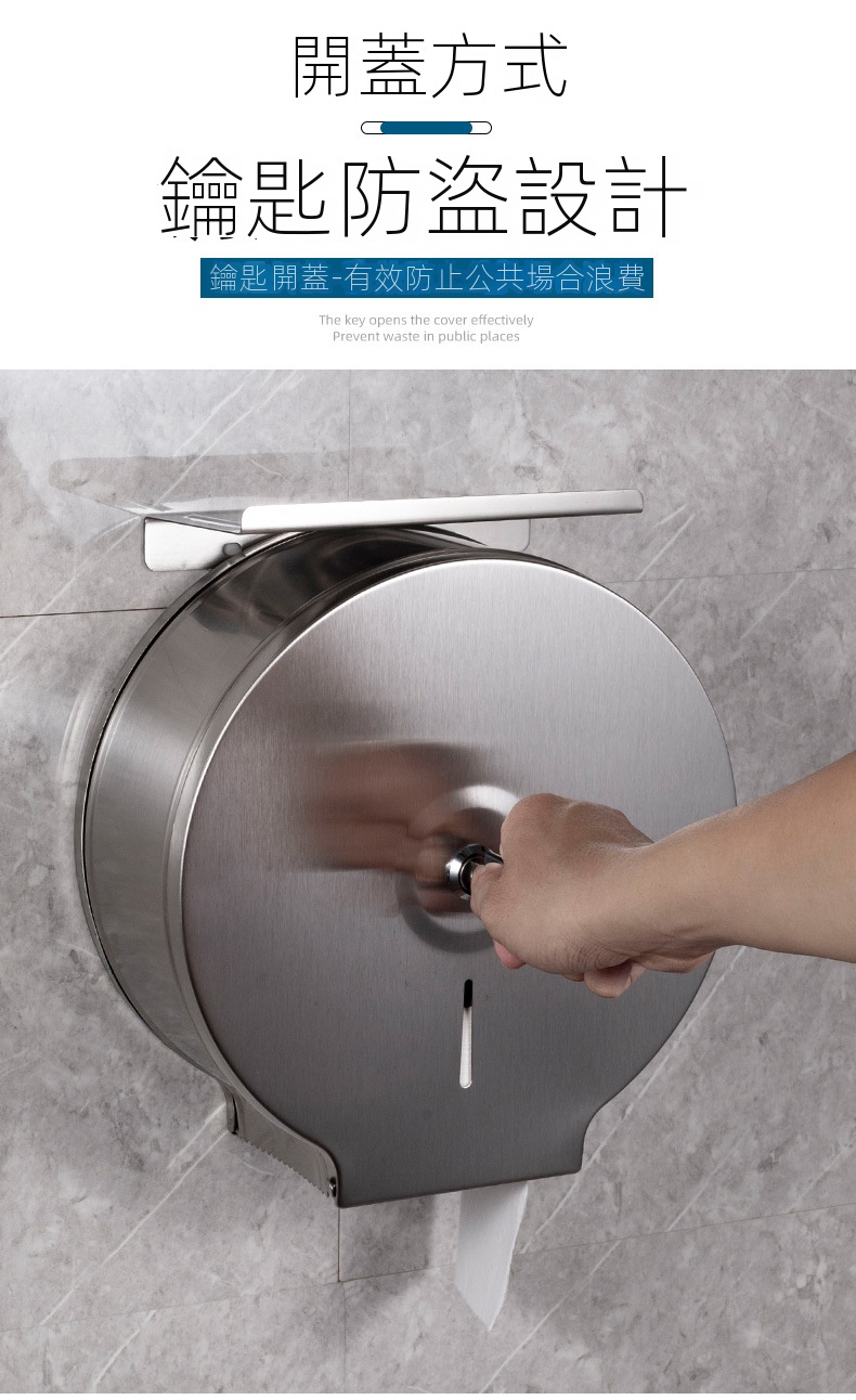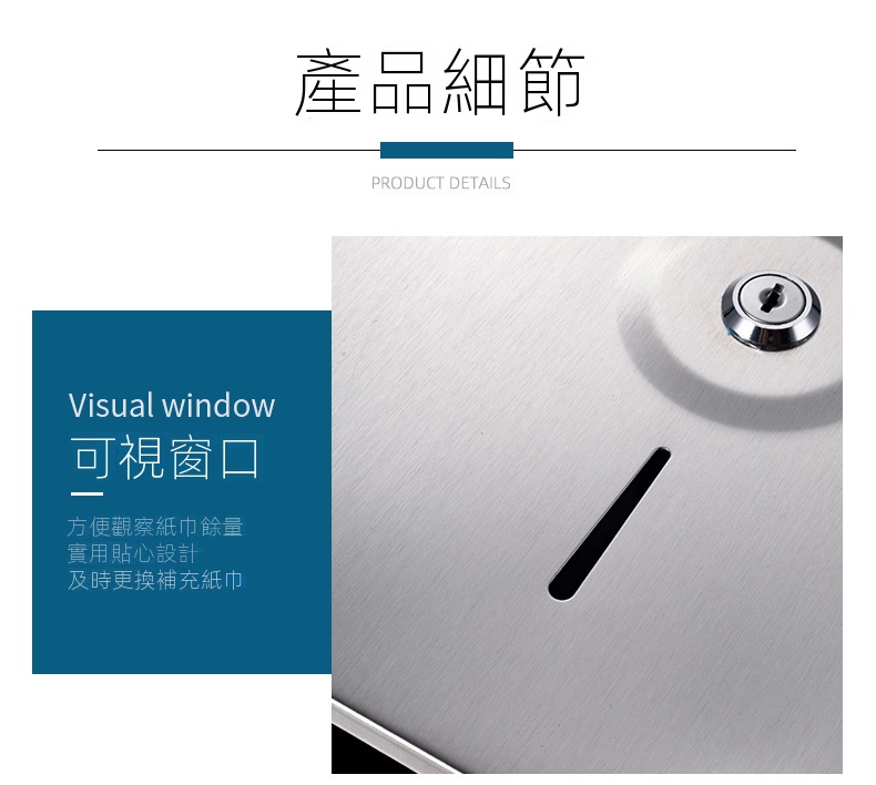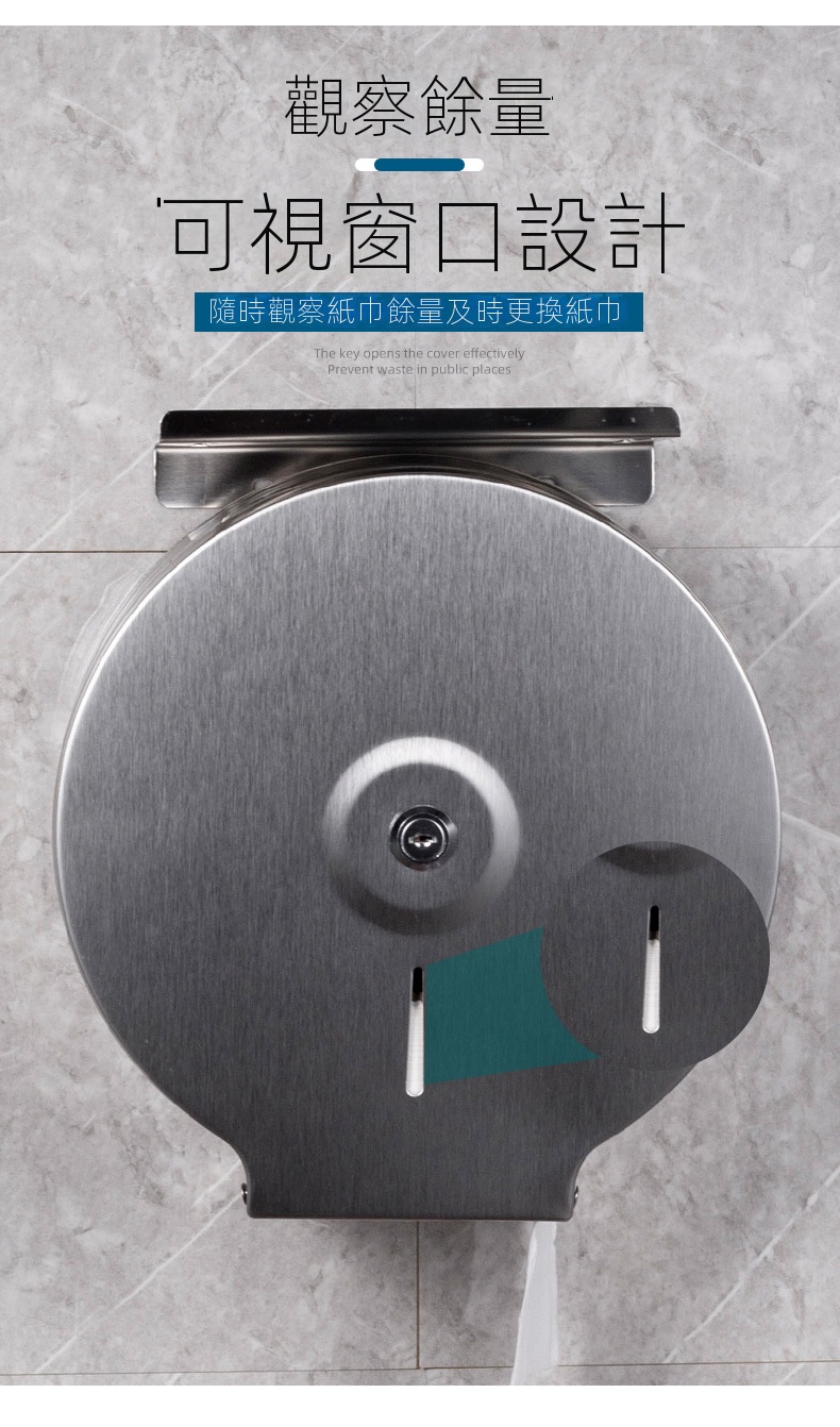 此款壁掛式不鏽鋼大卷衛生紙架,專為公共場所設計,配有鑰匙防盜開蓋,有效防止浪費,適合商場、寫字樓、醫院、學校等場景使用。它可以安裝於大理石、玻璃、金屬等多種牆面,同時可以免打孔安裝設計。內設可視窗方便觀察紙巾餘量,並具備鋸齒出紙口,確保出紙順暢不卡紙。客戶需要自行安裝產品。
